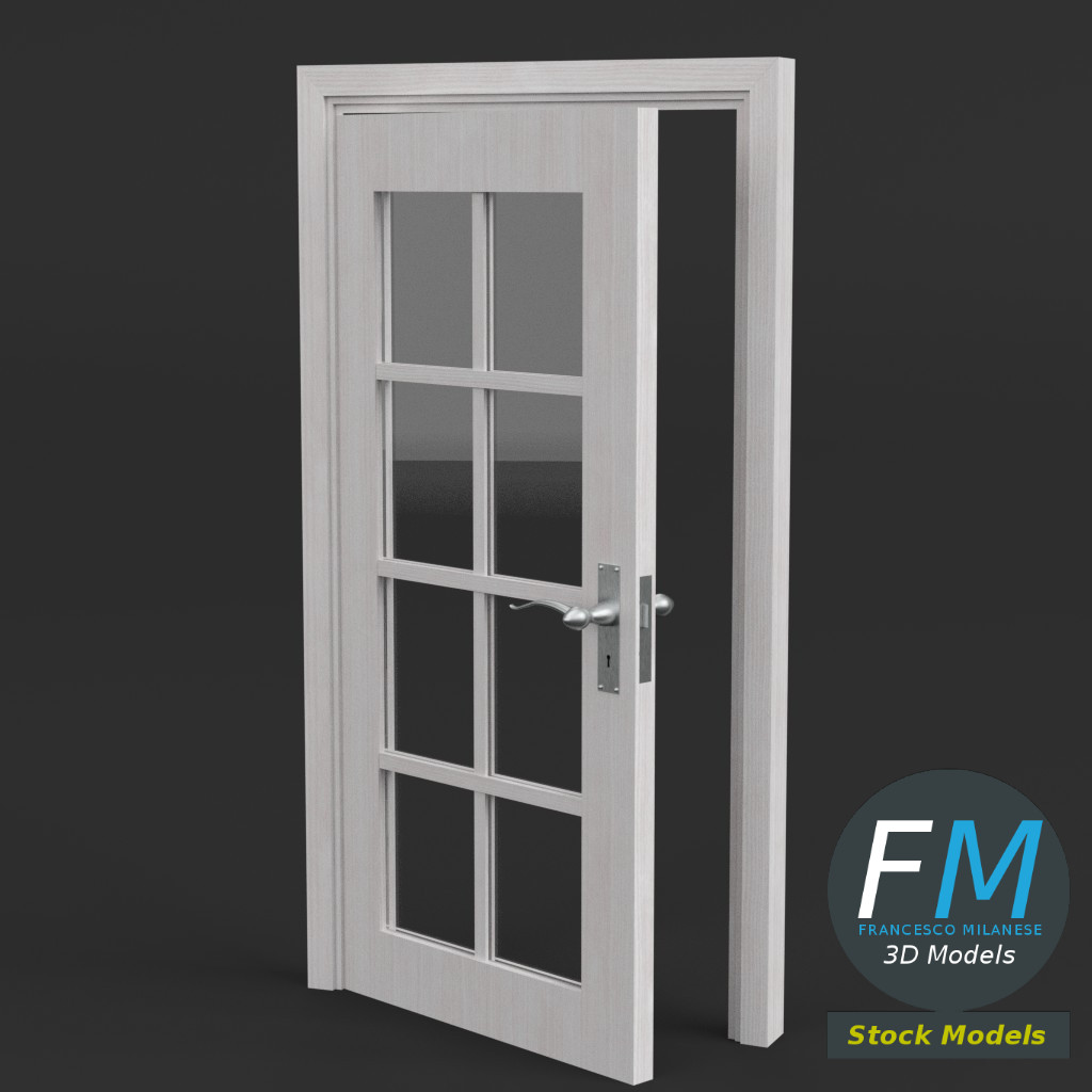 8 panel glass door 3D Model. 3 individual objects (frame, door, glass), each one with its own non overlapping UV Layout map, Material and PBR Textures set. Production-ready 3D Model, with PBR materials, textures, non overlapping UV Layout map provided in the package.