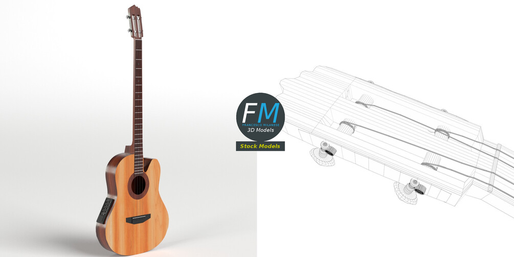 Acoustic bass guitar 3D Model. 3 objects (body, equalizer, strings), parented, each one with its own non overlapping UV Layout map, Material and PBR Textures set. Production-ready 3D Model, with PBR materials, textures, non overlapping UV Layout map provided in the package.