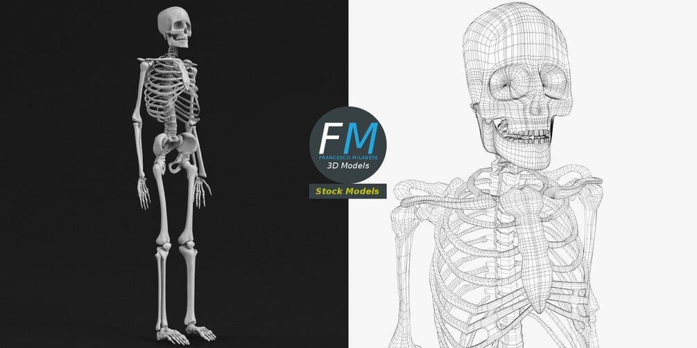 fm3d, game ready, vr, ar, anatomy, human, skeleton, skeletal, bones, internal, body, skull, femur, cravicle, spine, ribs, foot, femur, fibula