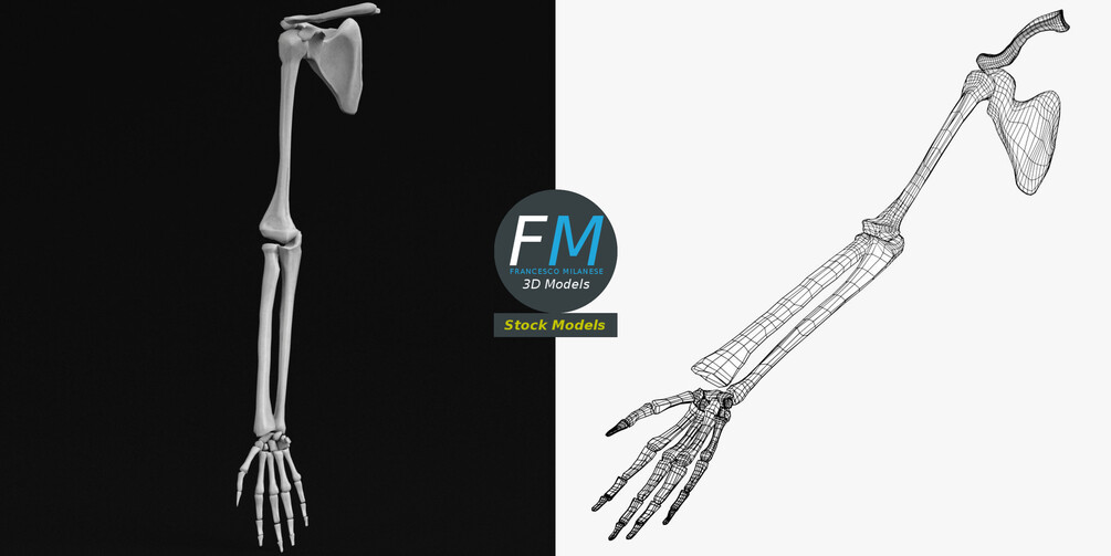 Anatomy - Hand and arm bones 3D Model. 6 individual objects (scapula, clavicula, humerus, radius, ulna, hand --- so you can rotate or even animate them) sharing the same non overlapping UV Layout map, Material and PBR Textures set. Production-ready 3D Model, with PBR materials, textures, non overlapping UV Layout map provided in the package.