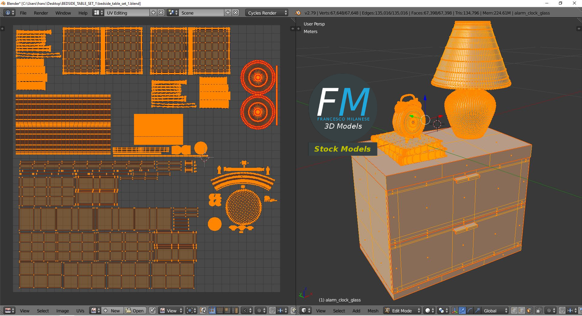 Bedside table set 3D Model, nr. 1 in my collection. 6 individual objects (bedside table, abat jour, book 1, book 2, alarm clock body, alarm clock glass), sharing 2 non overlapping UV Layout maps, Materials (set; glass) and PBR Textures set. Production-ready 3D Model, with PBR materials, textures, non overlapping UV Layout map provided in the package.