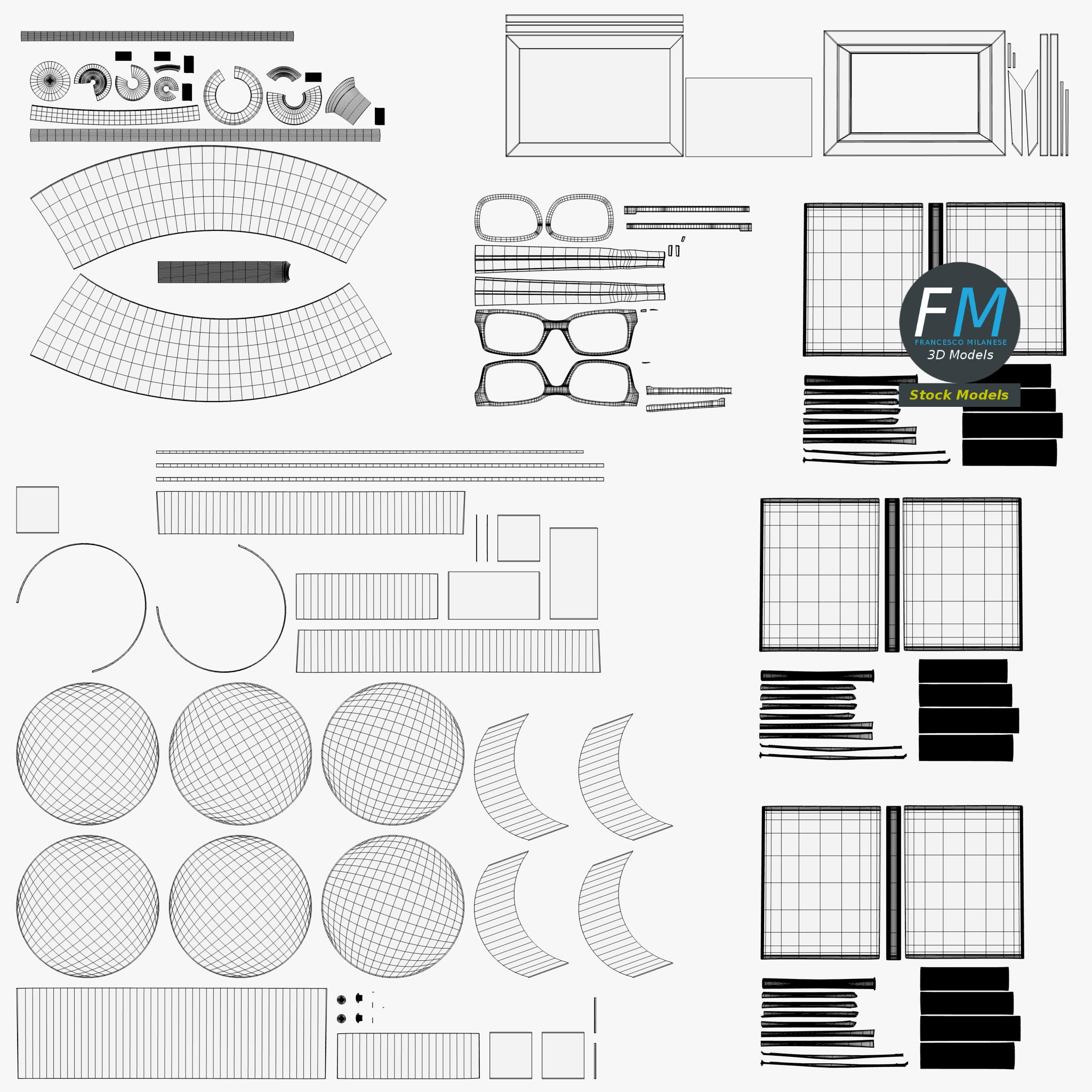 Easily customizable: UV unwrapped geometries, so you can create new Textures (or modify the existing ones) using the UV Layout maps provided in the package (as png with alpha).