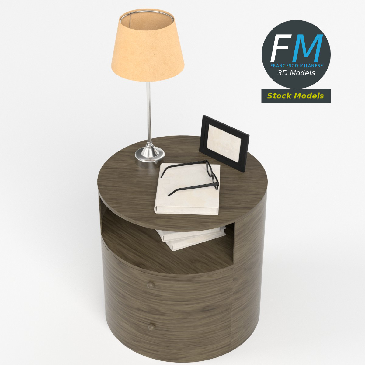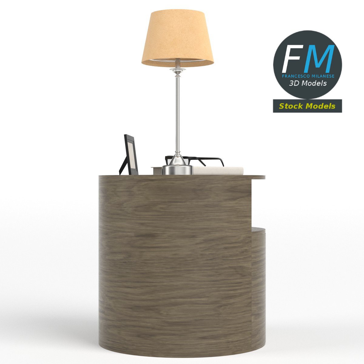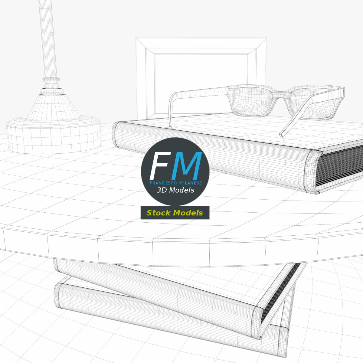 Bedside table set 3D Model, nr. 6 in my collection. 8 individual objects (table, book 1, book 2, book 3, glasses, lenses, frame, lamp), sharing 2 non overlapping UV Layout maps, Materials (bedside table set 6; lenses) and PBR Textures sets. Production-ready 3D Model, with PBR materials, textures, non overlapping UV Layout map provided in the package.