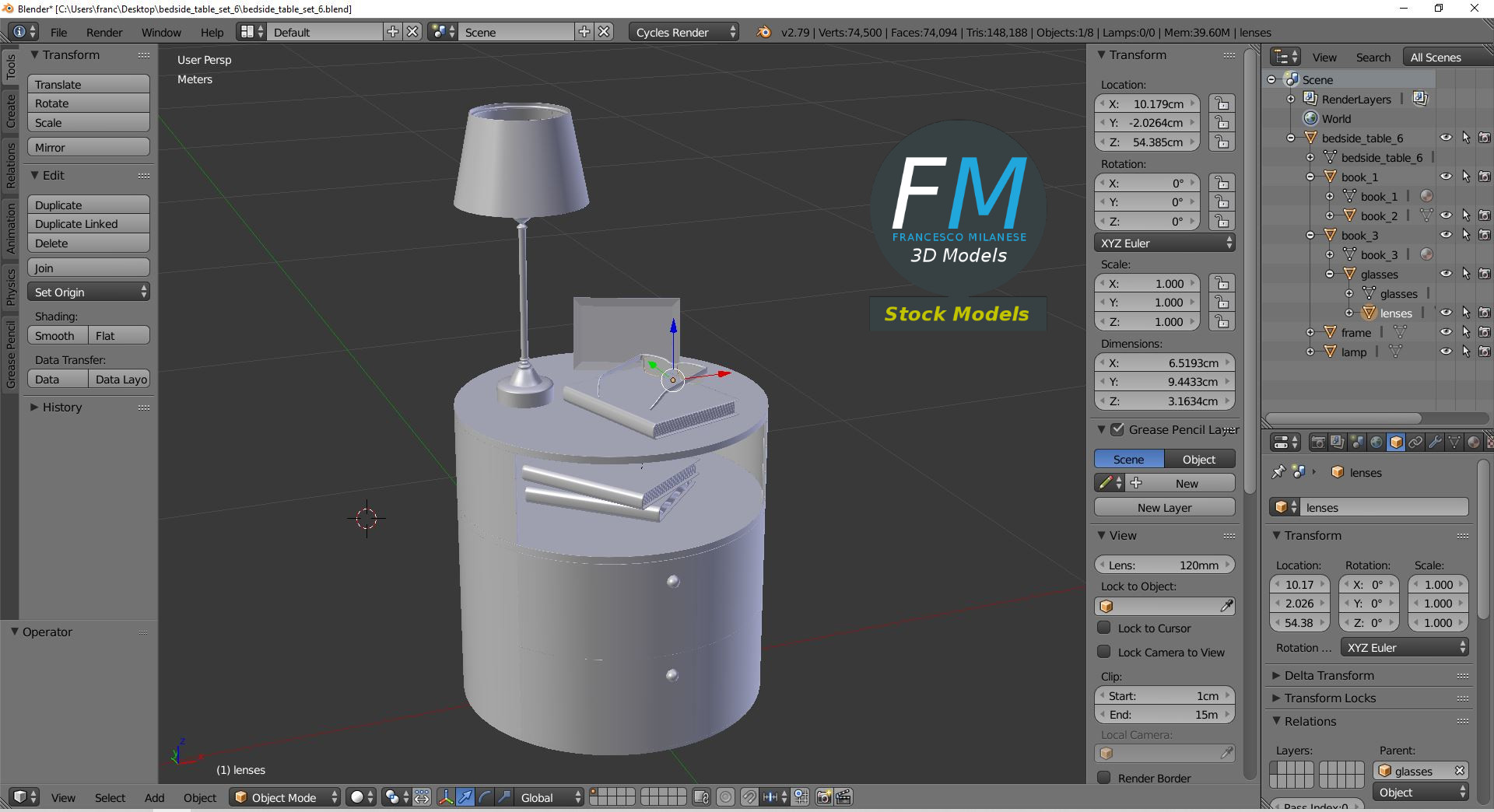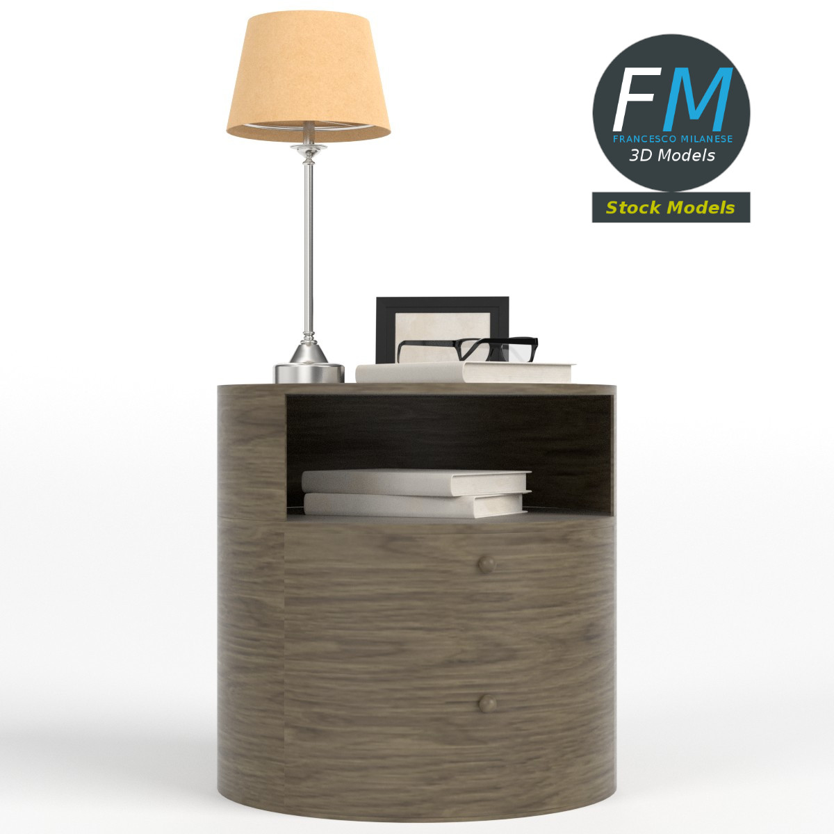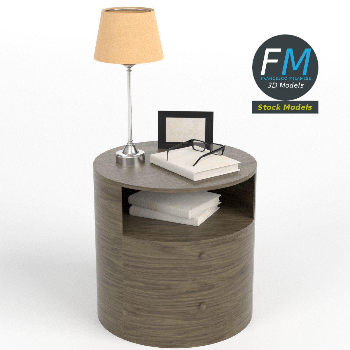 Bedside table set 3D Model, nr. 6 in my collection. 8 individual objects (table, book 1, book 2, book 3, glasses, lenses, frame, lamp), sharing 2 non overlapping UV Layout maps, Materials (bedside table set 6; lenses) and PBR Textures sets. Production-ready 3D Model, with PBR materials, textures, non overlapping UV Layout map provided in the package.