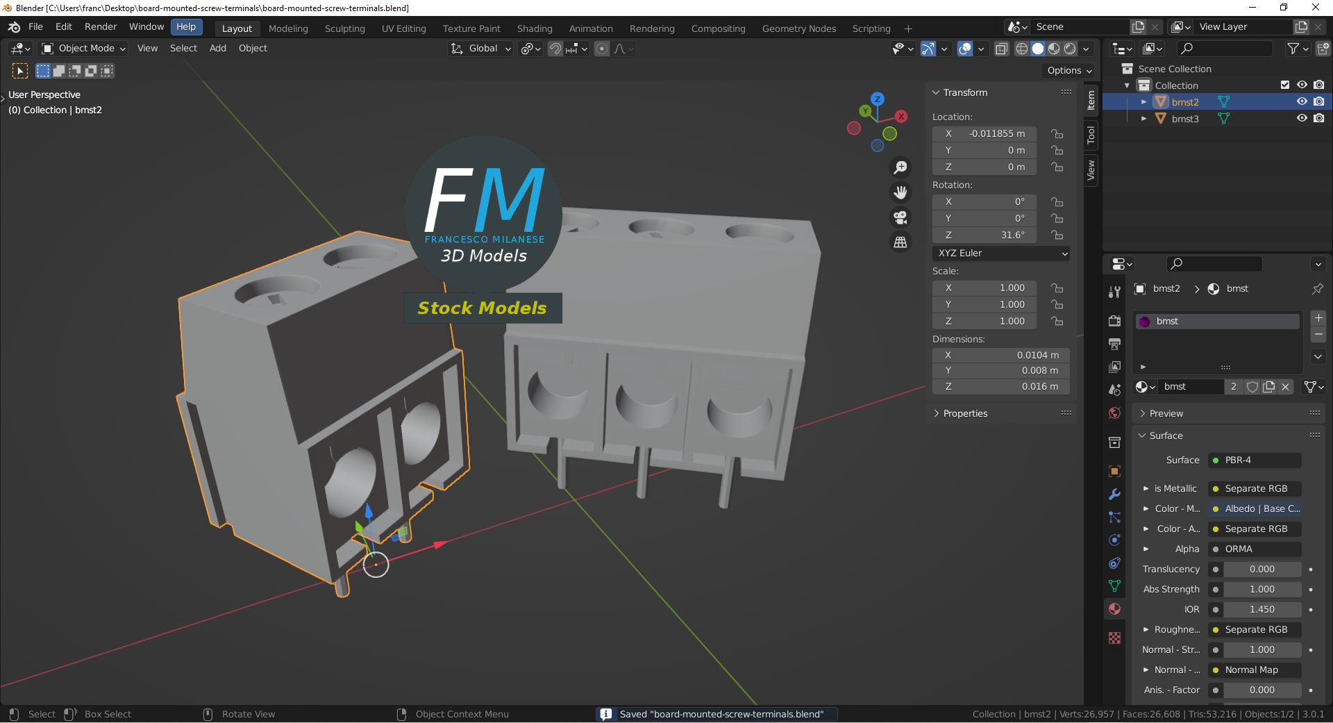 A couple of board mounted screw terminals 3D Models (a 2-way and a 3-way connector), sharing the same non overlapping UV Layout map, Material and PBR Textures sets. Production-ready 3D Model, with PBR materials, textures, non overlapping UV Layout map provided in the package.
