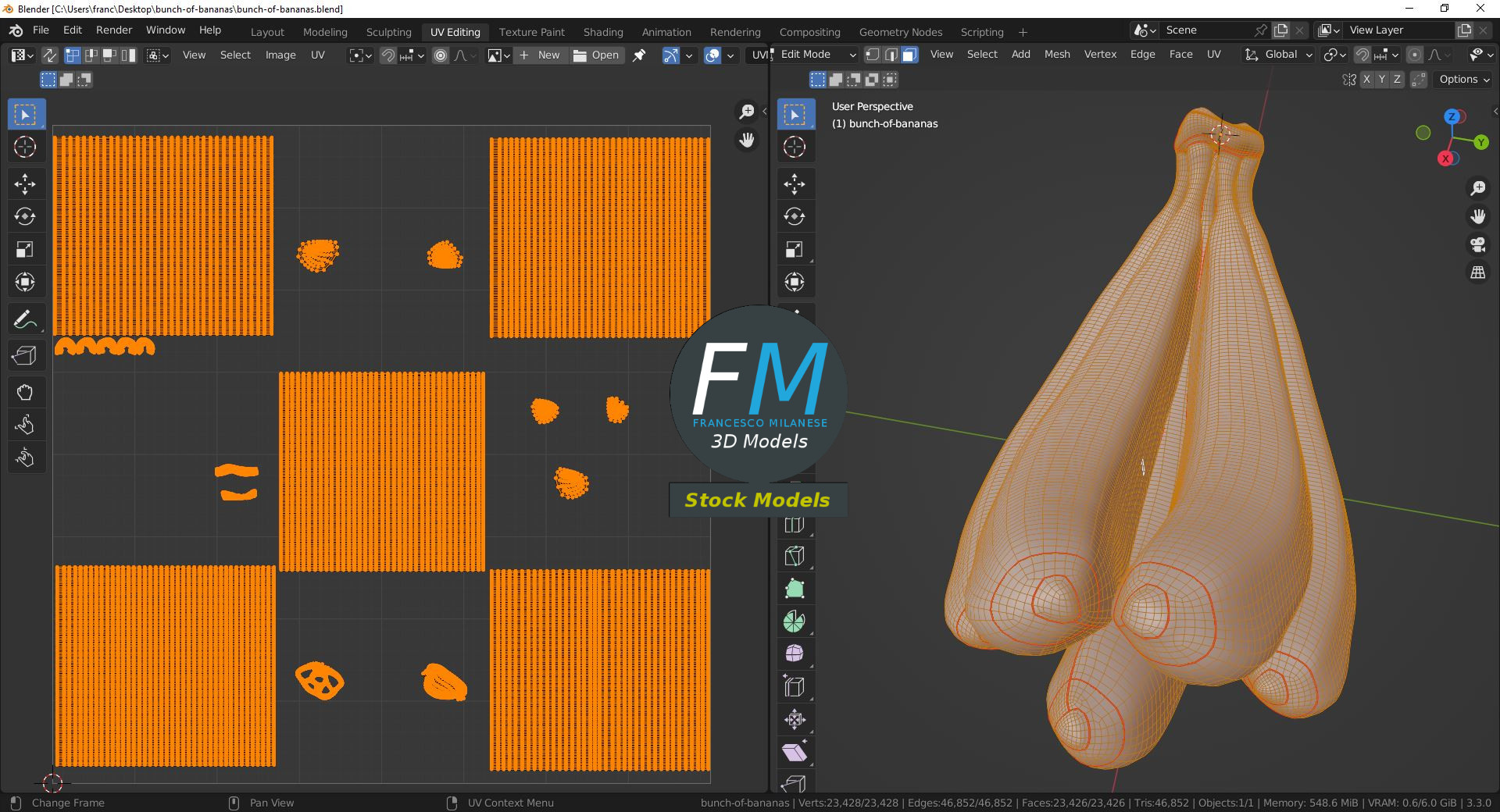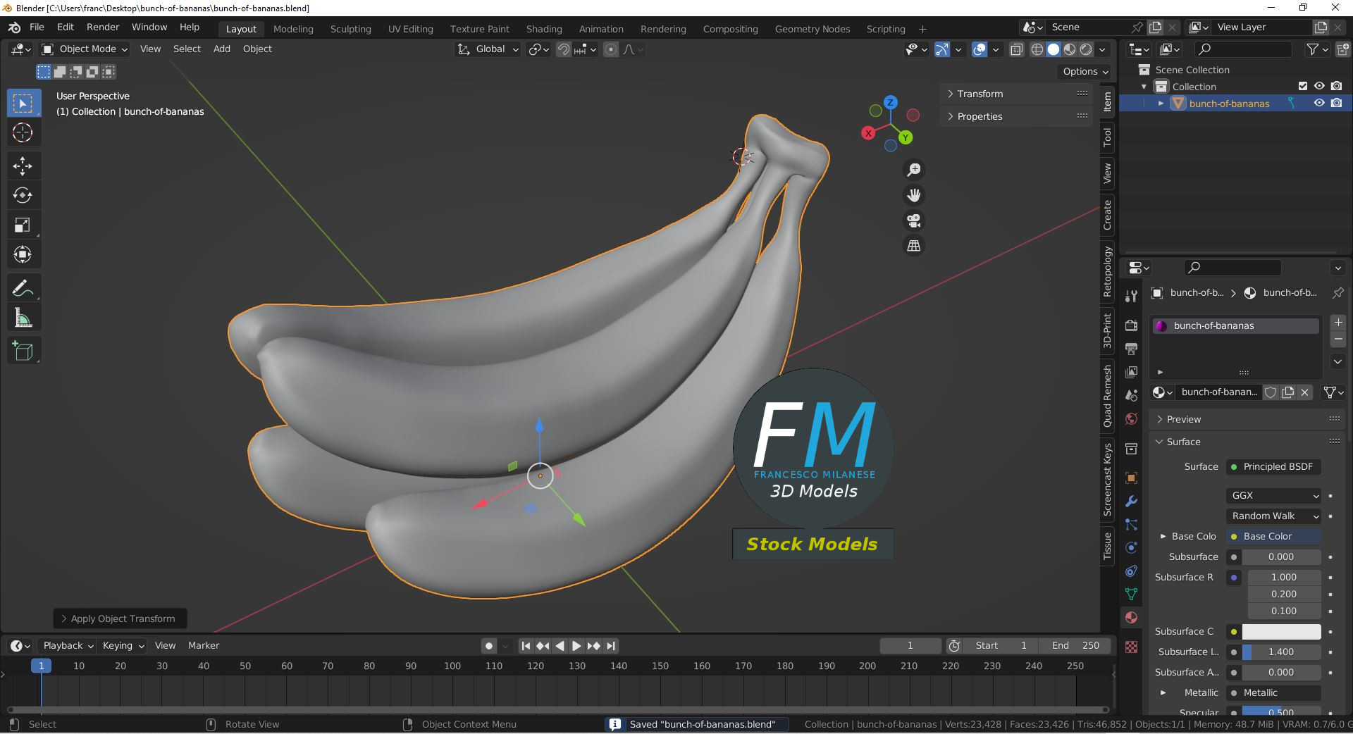Bunch of bananas 3D Model. Production-ready 3D Model, with PBR materials, textures, non overlapping UV Layout map provided in the package.