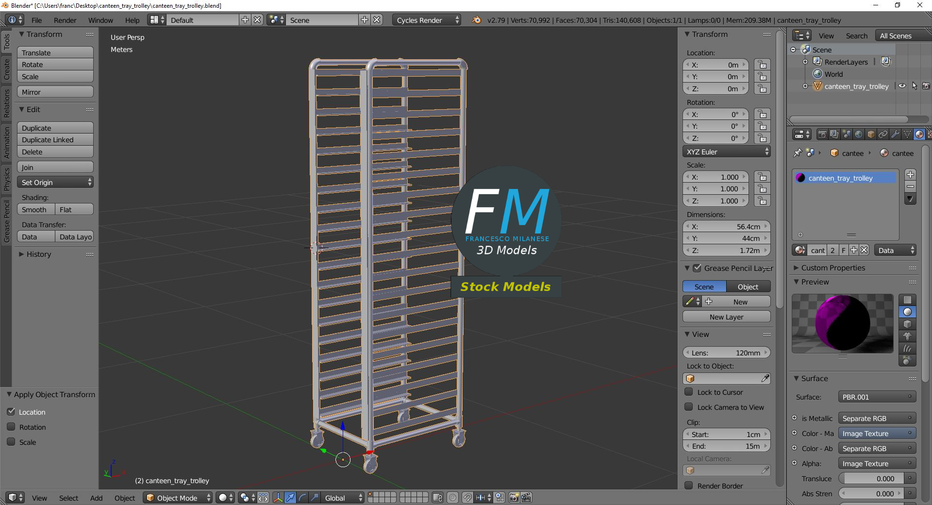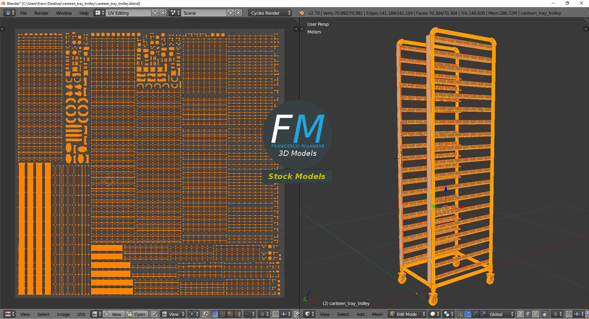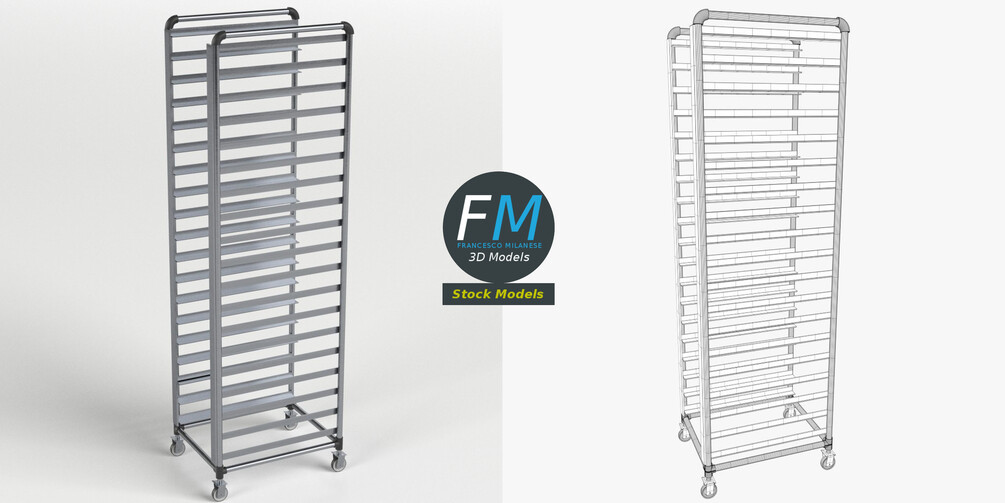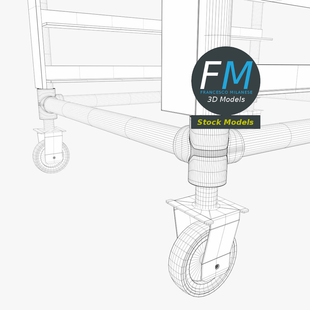 Canteen tray trolley 3D Model. 5 individual objects (the 4 wheels are individual objects, so you can rotate or even animate them) sharing the same non overlapping UV Layout map, Material and PBR Textures set. Production-ready 3D Model, with PBR materials, textures, non overlapping UV Layout map provided in the package.