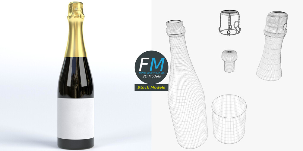 Champagne bottle 3D Model. 5 individual objects (glass, bottom label, cork top, metal, top label) sharing 2 non overlapping UV Layout map, Materials (glass; labels and cork top) and PBR Textures set. Production-ready 3D Model, with PBR materials, textures, non overlapping UV Layout map provided in the package.