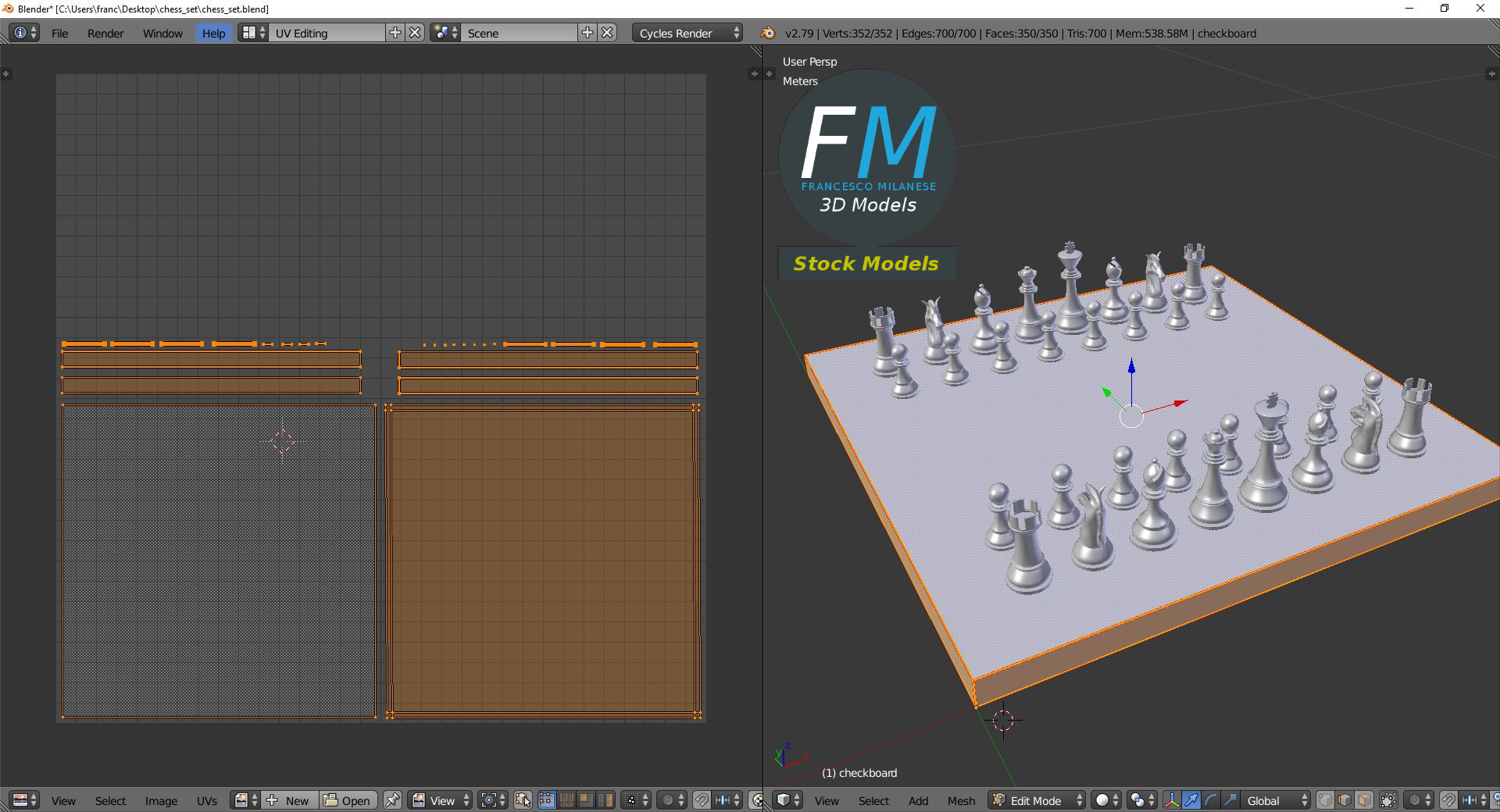 Chess set 3D Model. 33 individual objects (so you can easily move, duplicate, delete or even animate them), sharing 3 non overlapping UV Layout map, Materials (black pieces, white pieces, checkboard) and PBR Textures set. Production-ready 3D Model, with PBR materials, textures, non overlapping UV Layout map provided in the package.