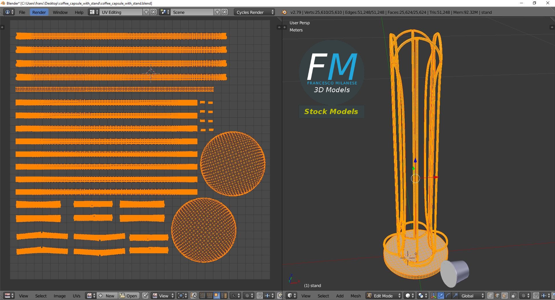 Coffee capsule with stand 3D Model. 2 individual objects (stand, coffee capsule; useful as a template or mock-up for advertising or merchandising), each one with its own non overlapping UV Layout map, Material and PBR Textures set. Production-ready 3D Model, with PBR materials, textures, non overlapping UV Layout map provided in the package.