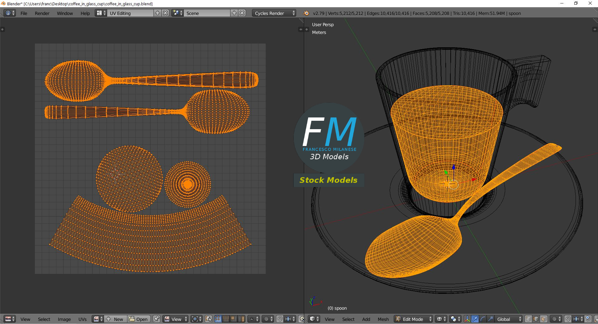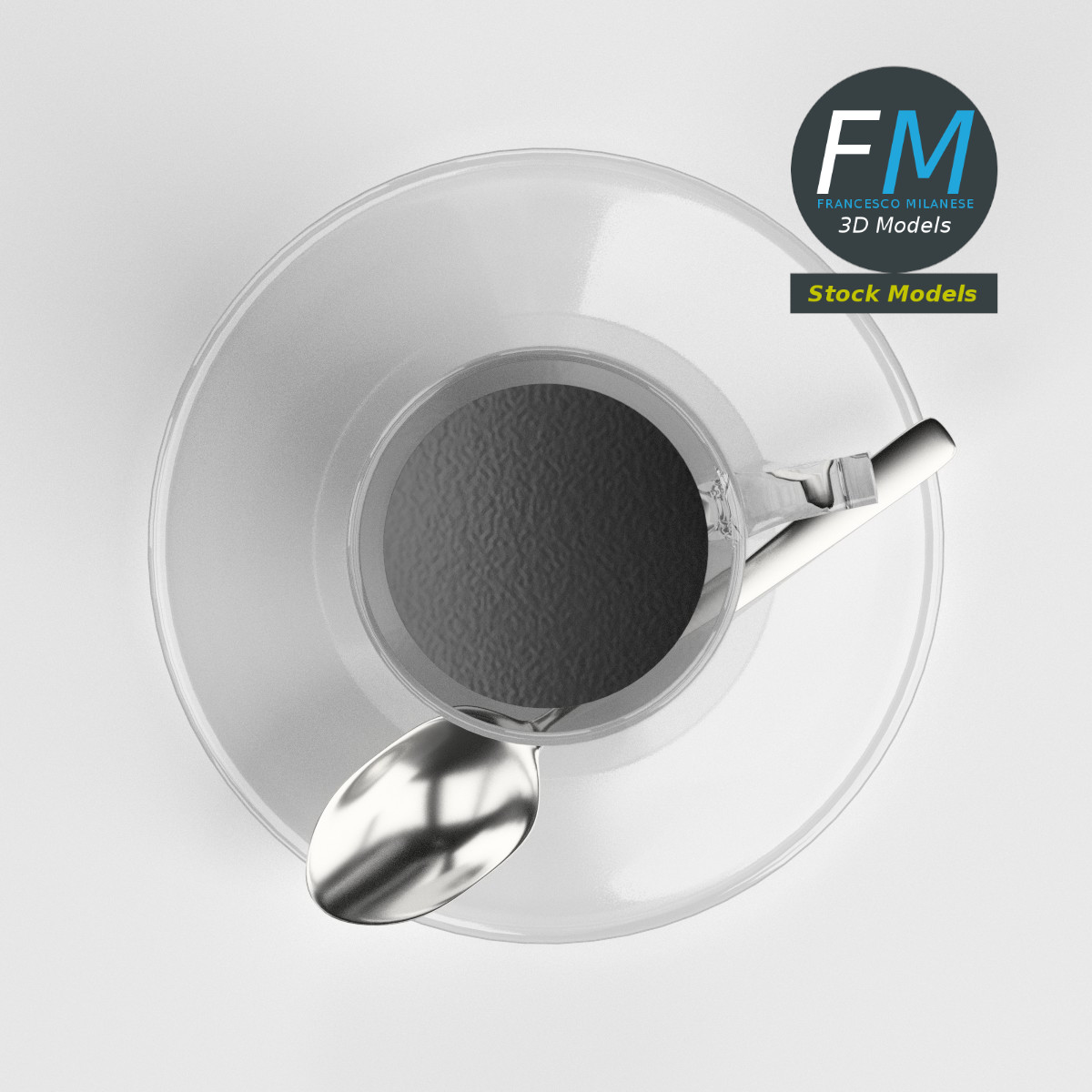 Coffee in glass cup 3D Model. 4 individual objects (cup, saucer, spoon, coffee), sharing 2 non overlapping UV Layout maps, Materials (glass, coffee_and_spoon) and PBR Textures sets. Production-ready 3D Model, with PBR materials, textures, non overlapping UV Layout map provided in the package.