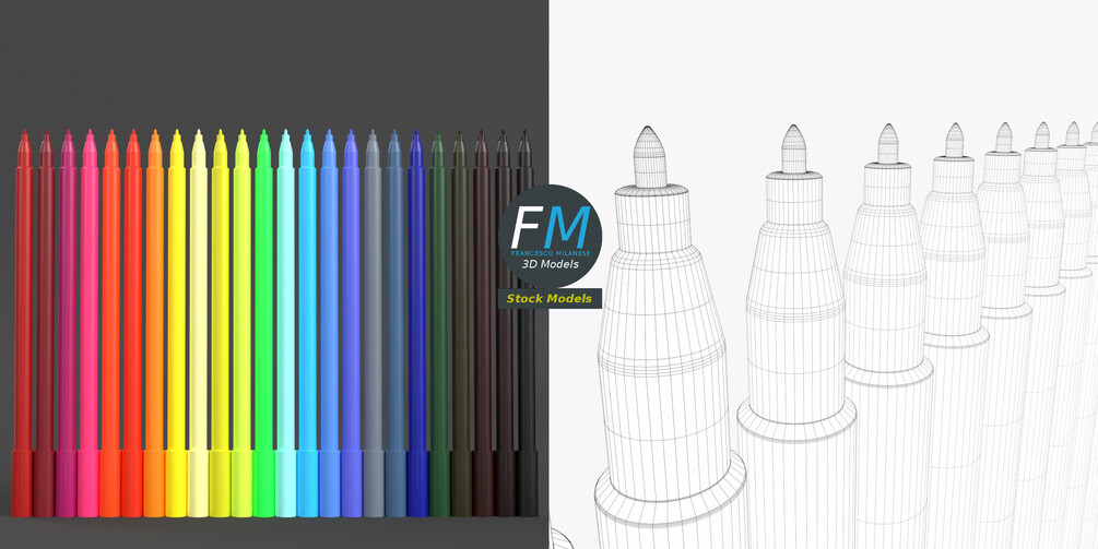 A set of 24 coloured marker pens and caps 3D Models. 48 individual objects sharing the same non overlapping UV Layout map, Material and PBR Textures set. Production-ready 3D Model, with PBR materials, textures, non overlapping UV Layout map provided in the package.