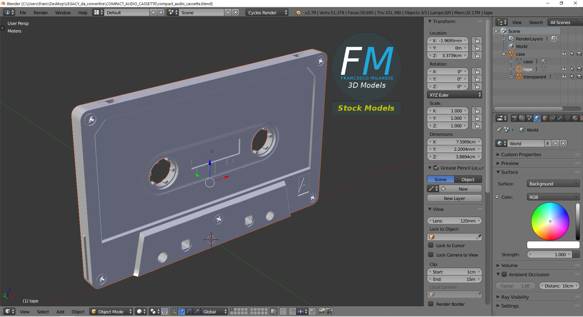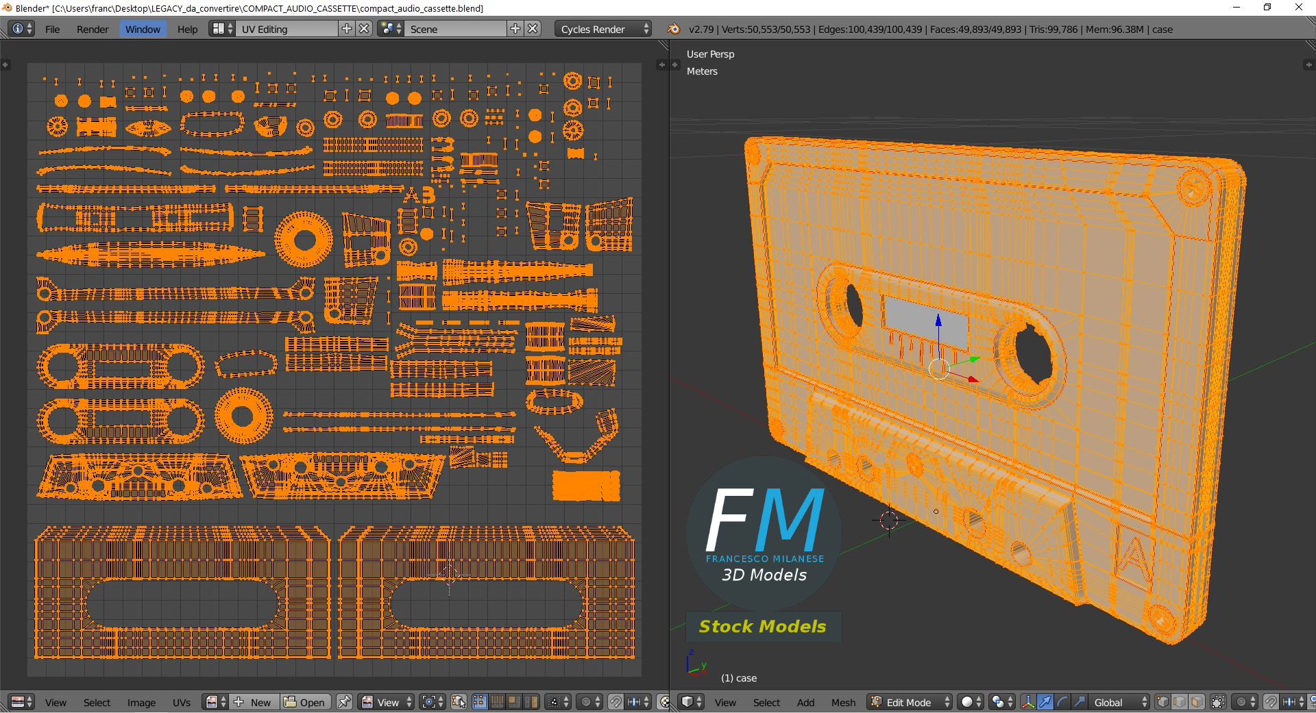 Compact audio cassette 3D Model. 3 individual objects (case, tape, transparent), each one with its own non overlapping UV Layout map, Material and PBR Textures set. Production-ready 3D Model, with PBR materials, textures, non overlapping UV Layout map provided in the package.