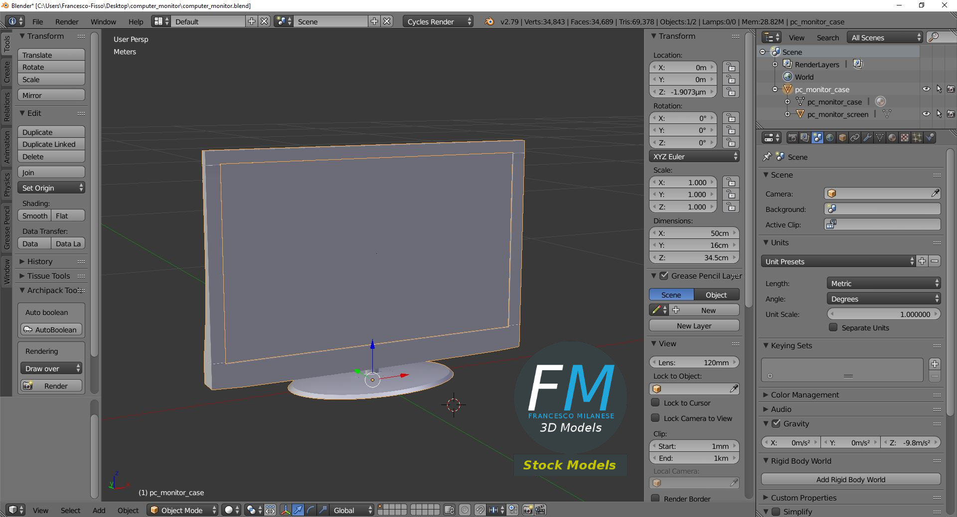 Real world dimensions; scene scale units: cm in Blender 3D (that is: Metric with 0.01 scale).