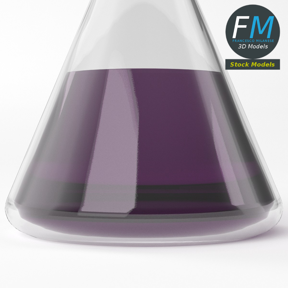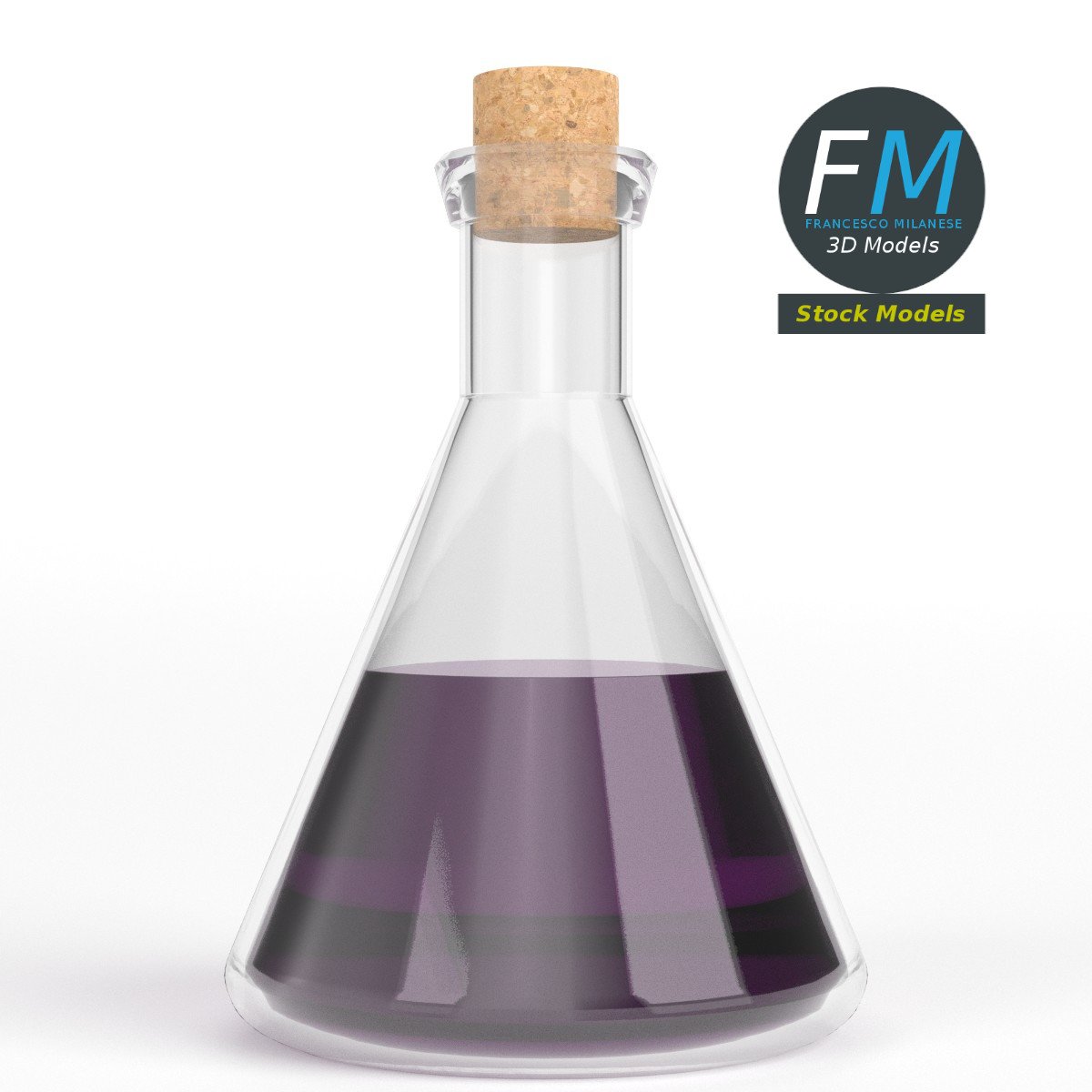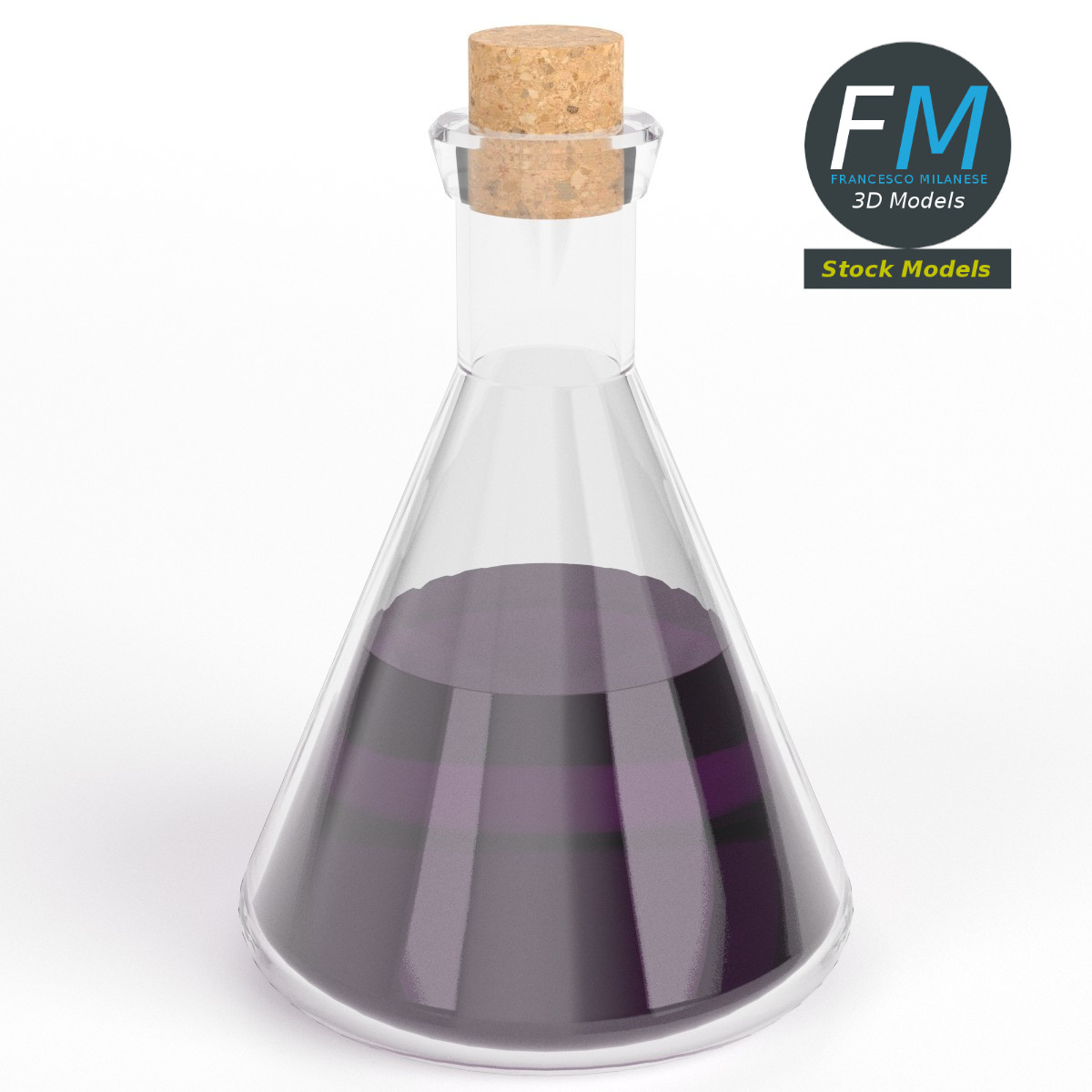 Conical potion flask 3D Model. 3 individual objects (flask, cork top, liquid), each one with its own non overlapping UV Layout map, Material and PBR Textures set. Production-ready 3D Model, with PBR materials, textures, non overlapping UV Layout map provided in the package.