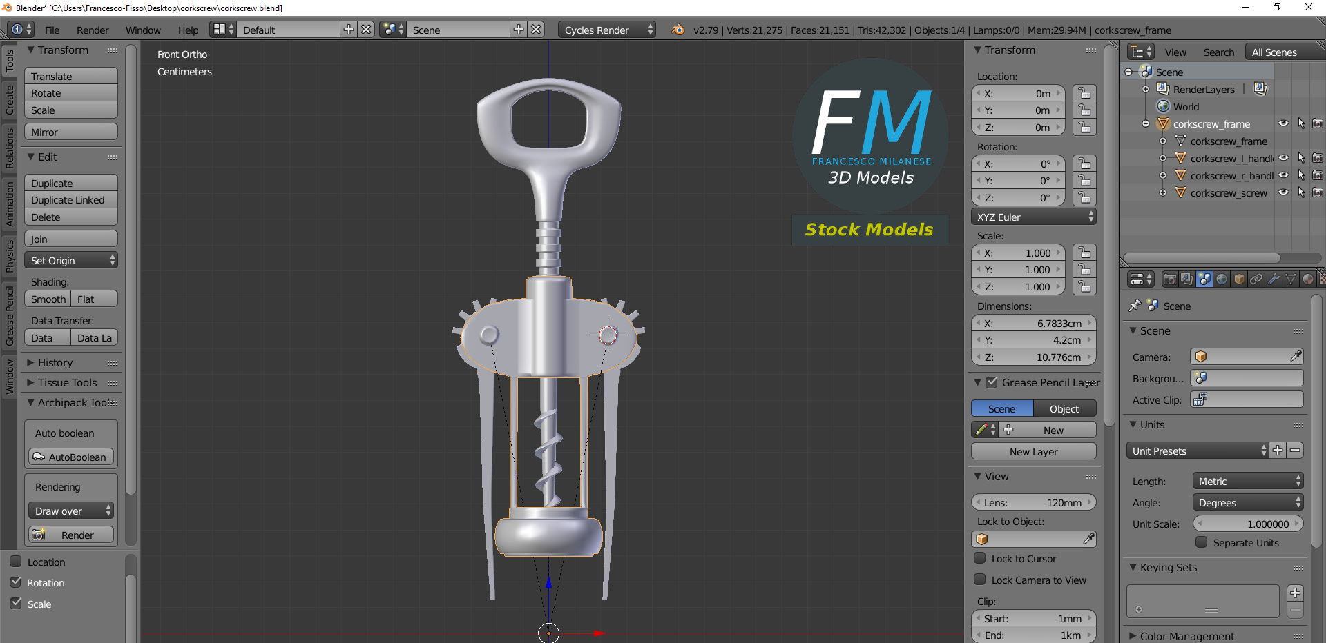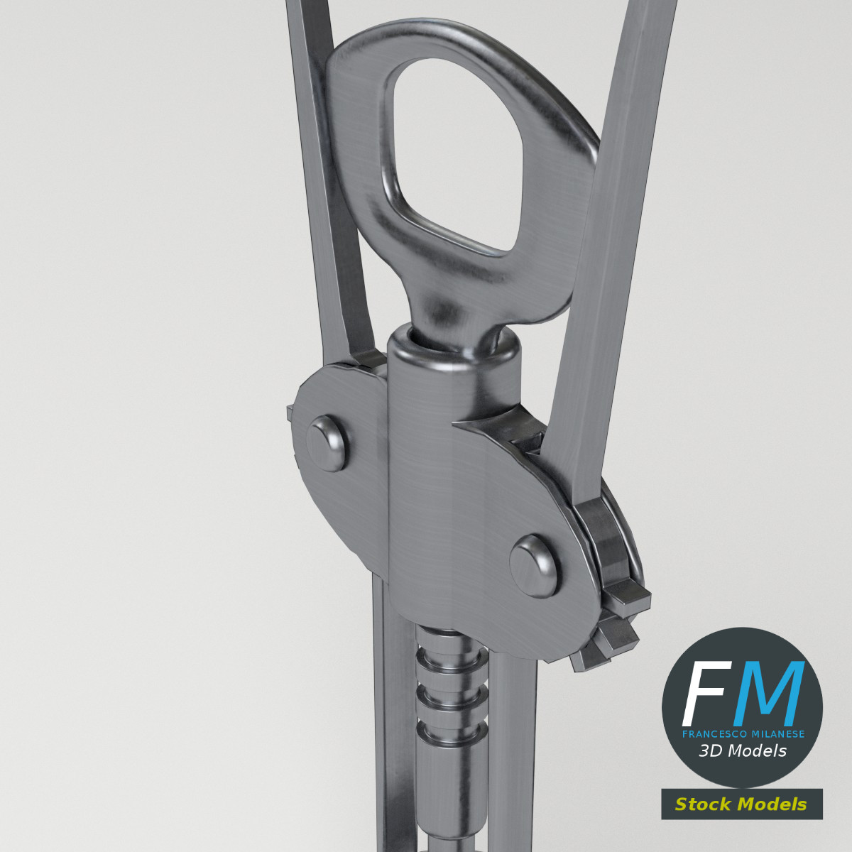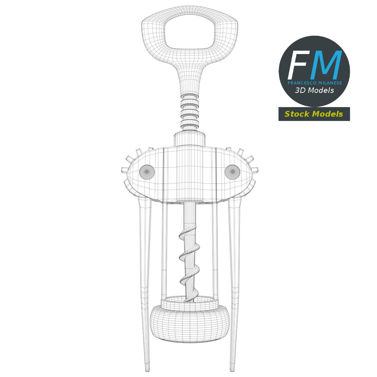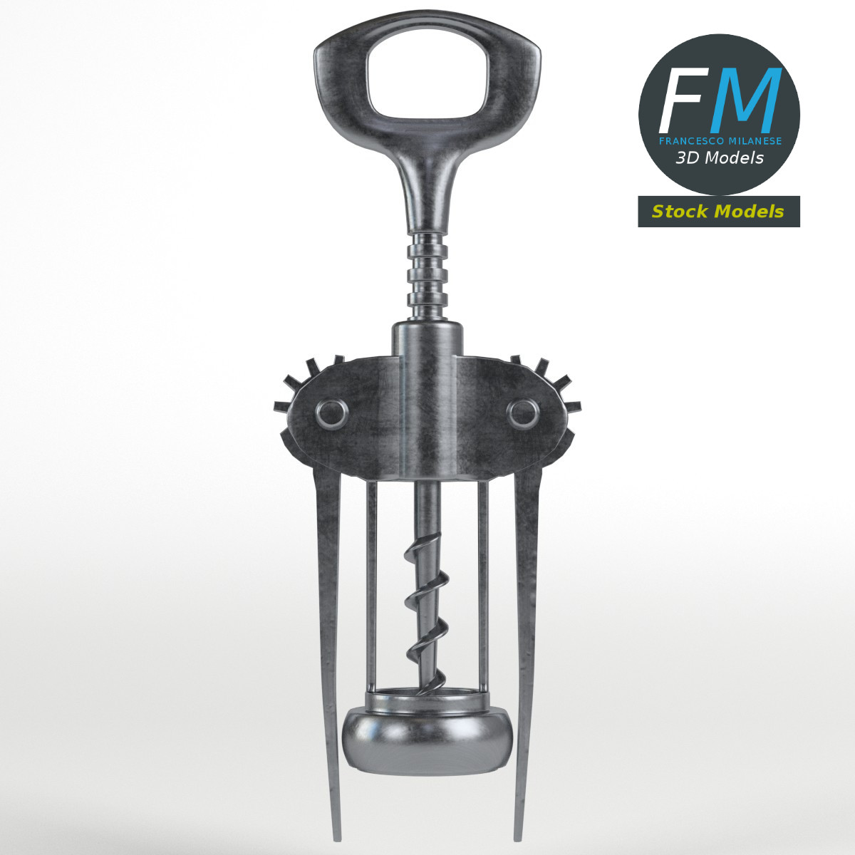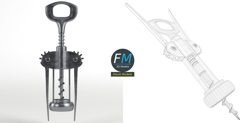 Winged Corkscrew (or: butterfly corkscrew, extector) 3D Model; 4 objects (frame, screw, left handle, right handle), parented, sharing the same non overlapping UV Layout map, Material and PBR Textures set. You can easily rig, open/close, edit or animate the object, because the handles have their origins in the hinges (see preview images). Production-ready 3D Model, with PBR materials, textures, and non overlapping UV Layout map provided in the package.