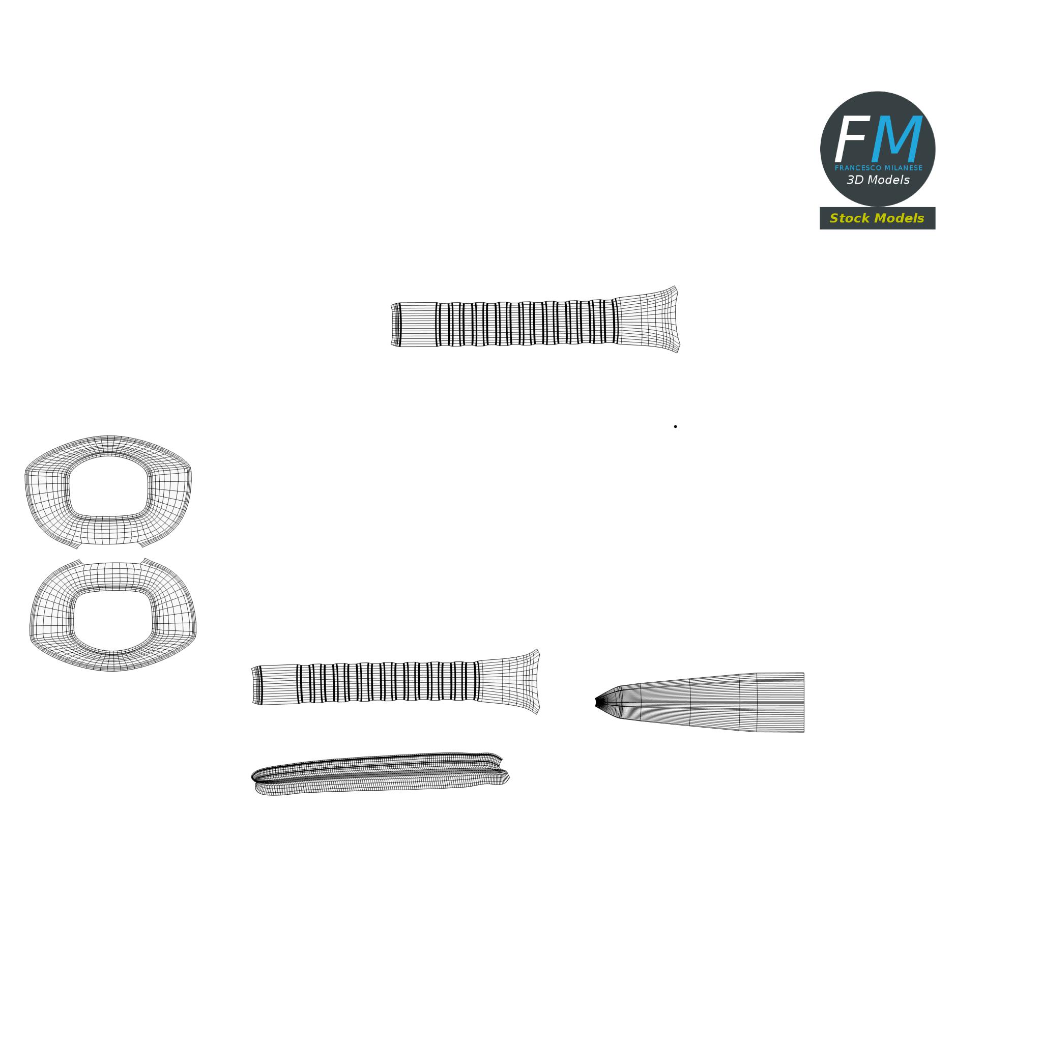 4 Objects (meshes), 1 PBR Material (in the Blender Cycles scene), UV unwrapped (non overlapping UV Layout map provided in the package); UV-mapped Textures.