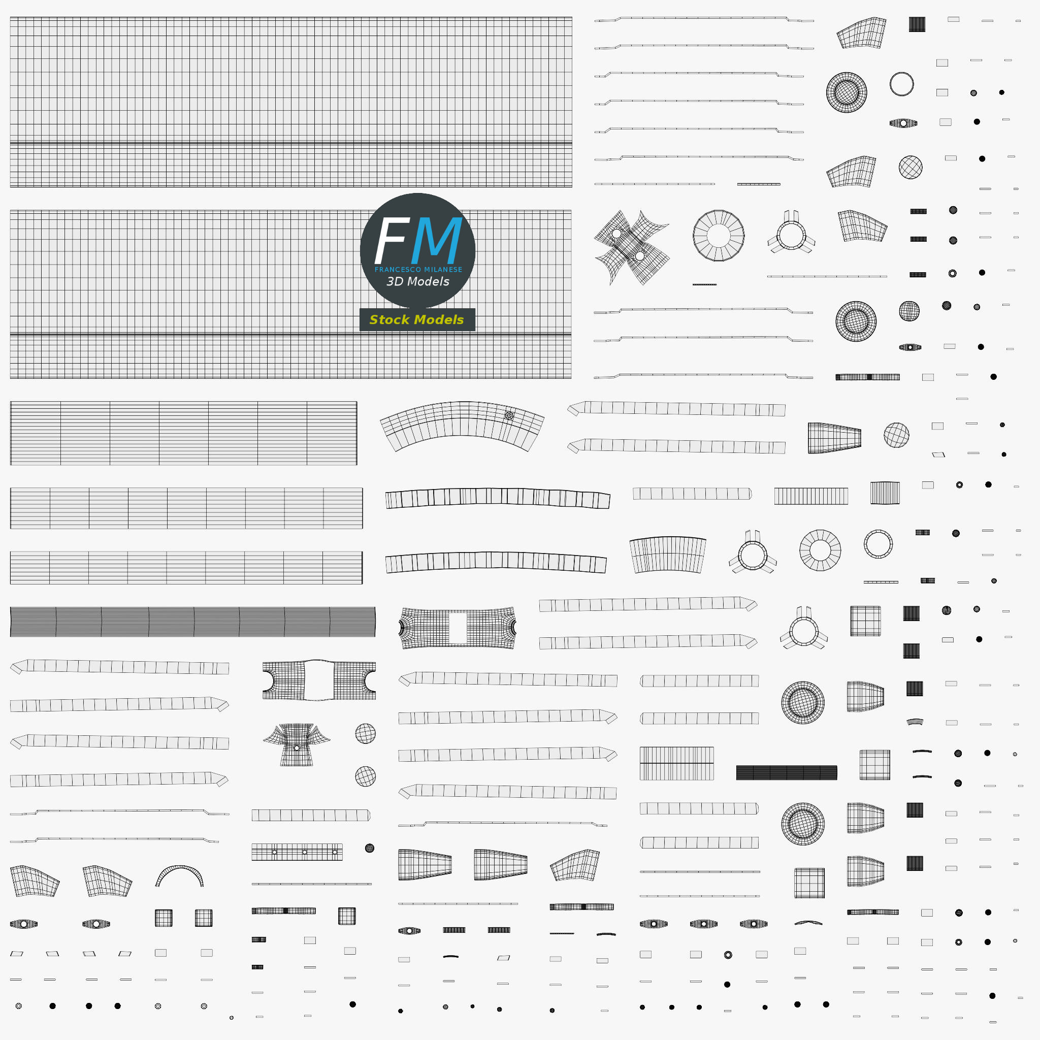 Easily customizable: UV unwrapped geometries; UV Layout maps provided in the package as png with alpha images.