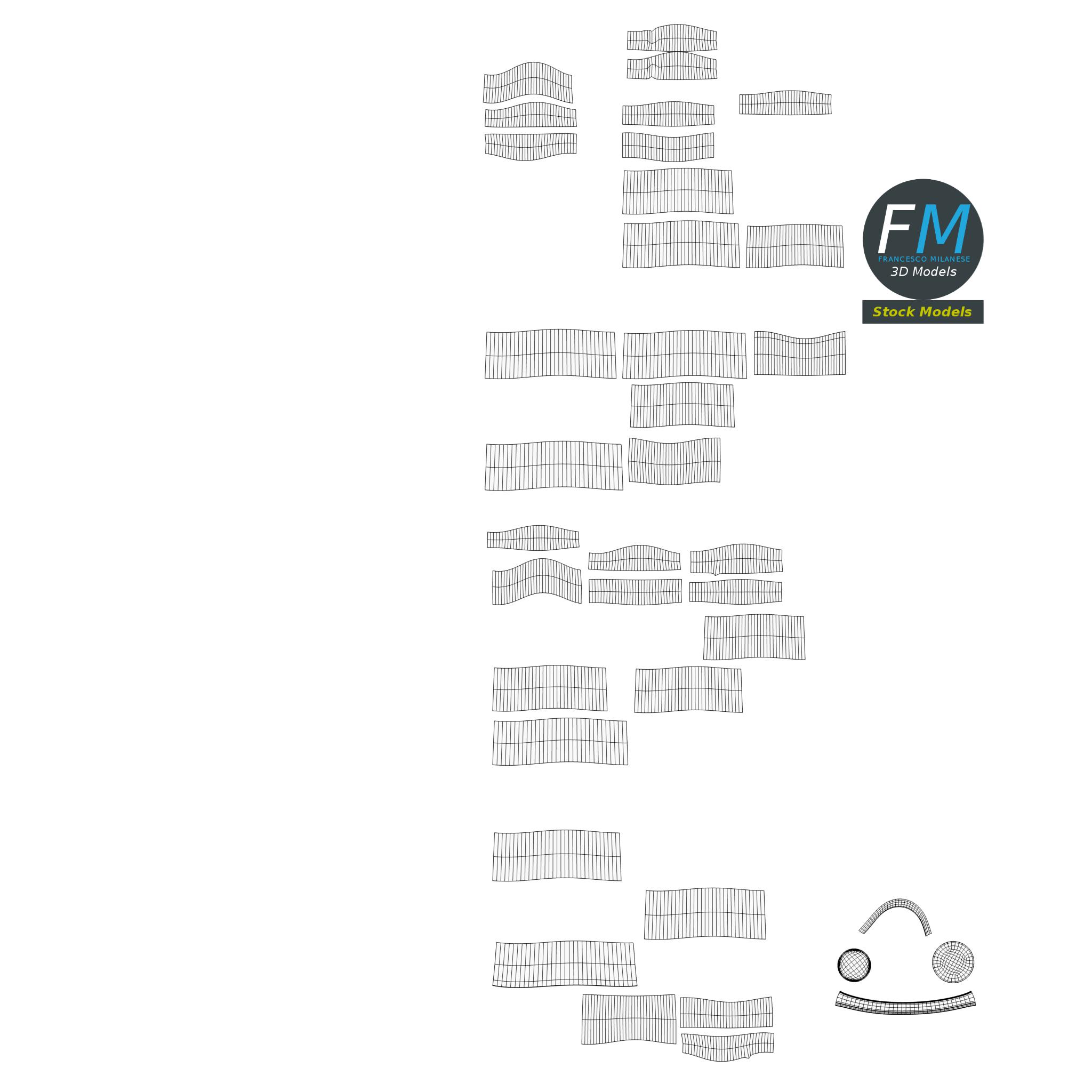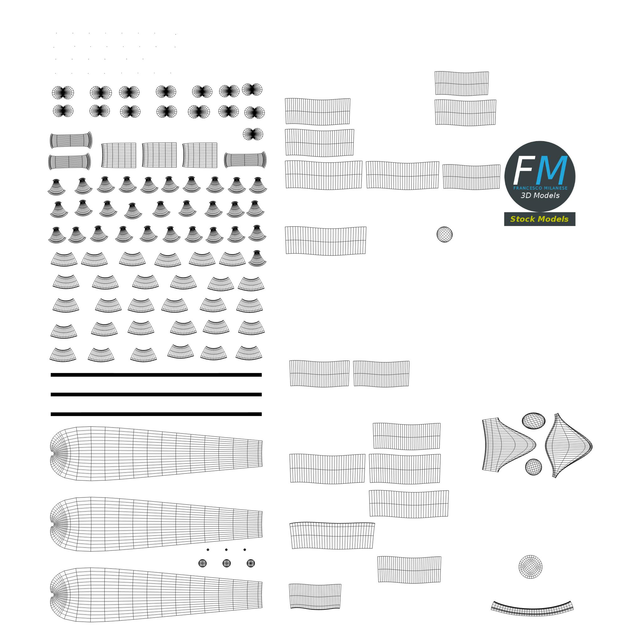 Easily customizable: UV unwrapped geometries, so you can create new Textures (or modify the existing ones) using the UV Layout maps provided in the package (as png with alpha).
