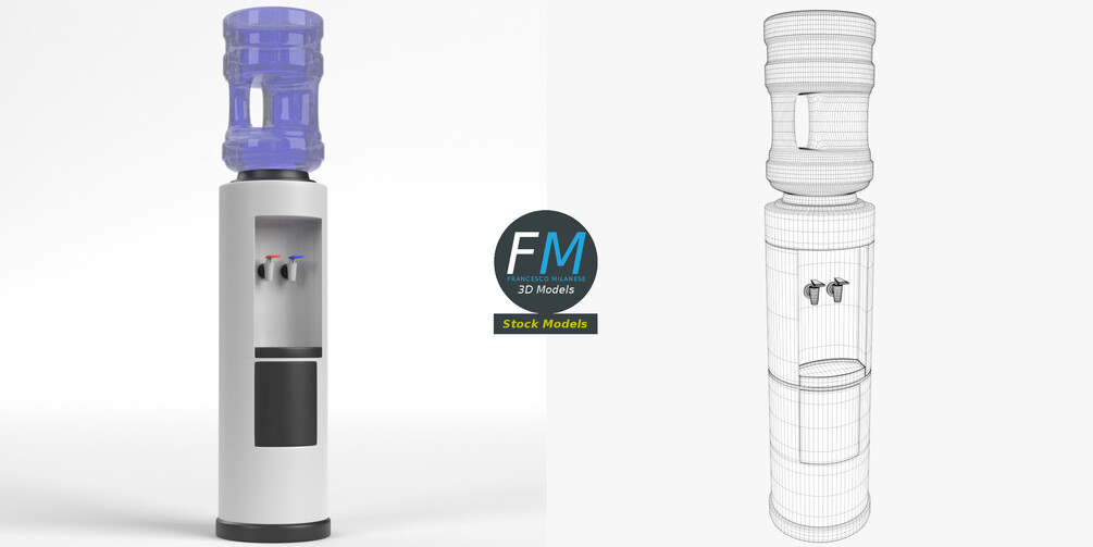 Cylindrical water cooler 3D Model. 2 individual objects (jug, water cooler), each one with its own non overlapping UV Layout map, Material and PBR Textures set. Production-ready 3D Model, with PBR materials, textures, non overlapping UV Layout map provided in the package.