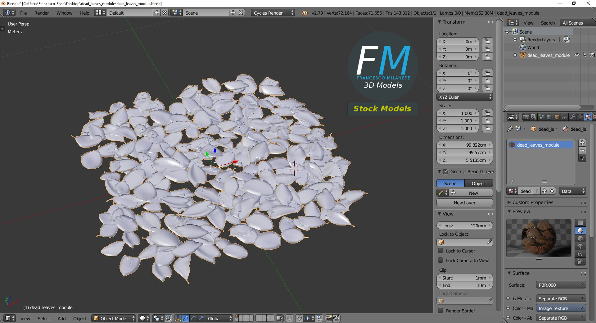 Dead leaves module 3D Model; use it in your outdoor archviz / landascape scenes. SINGLE OBJECT. Textures with Alpha (transparency) provided as PNG in the package. Production-ready 3D Model, with PBR materials, textures, and an OVERLAPPING UV Layout map provided in the package.