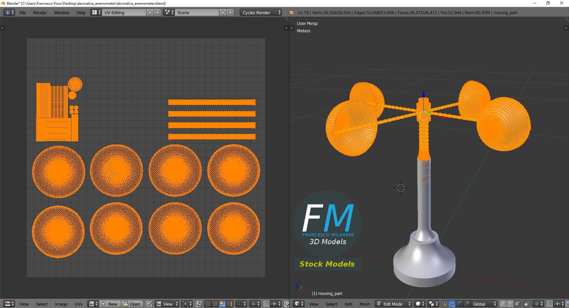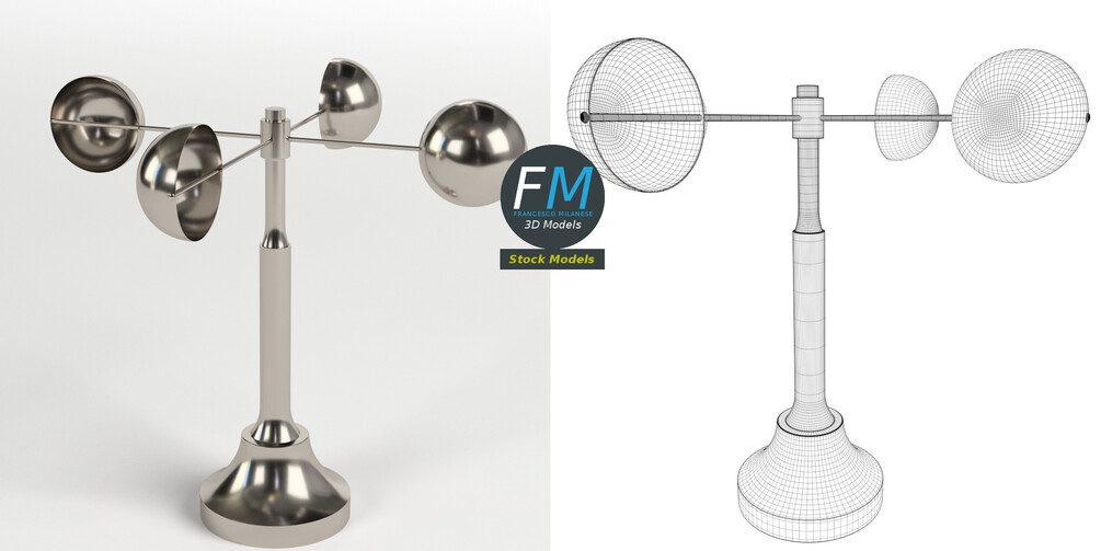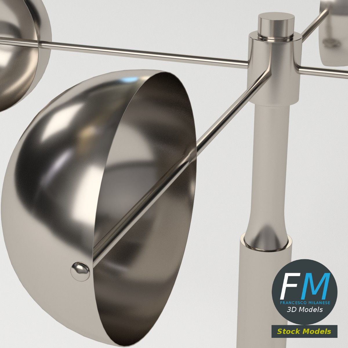 Decorative anemometer 3D Model. 2 objects (moving part, base), parented, each one with its own non overlapping UV Layout map, Material and PBR Textures base. Production-ready 3D Model, with PBR materials, textures, non overlapping UV Layout map provided in the package.