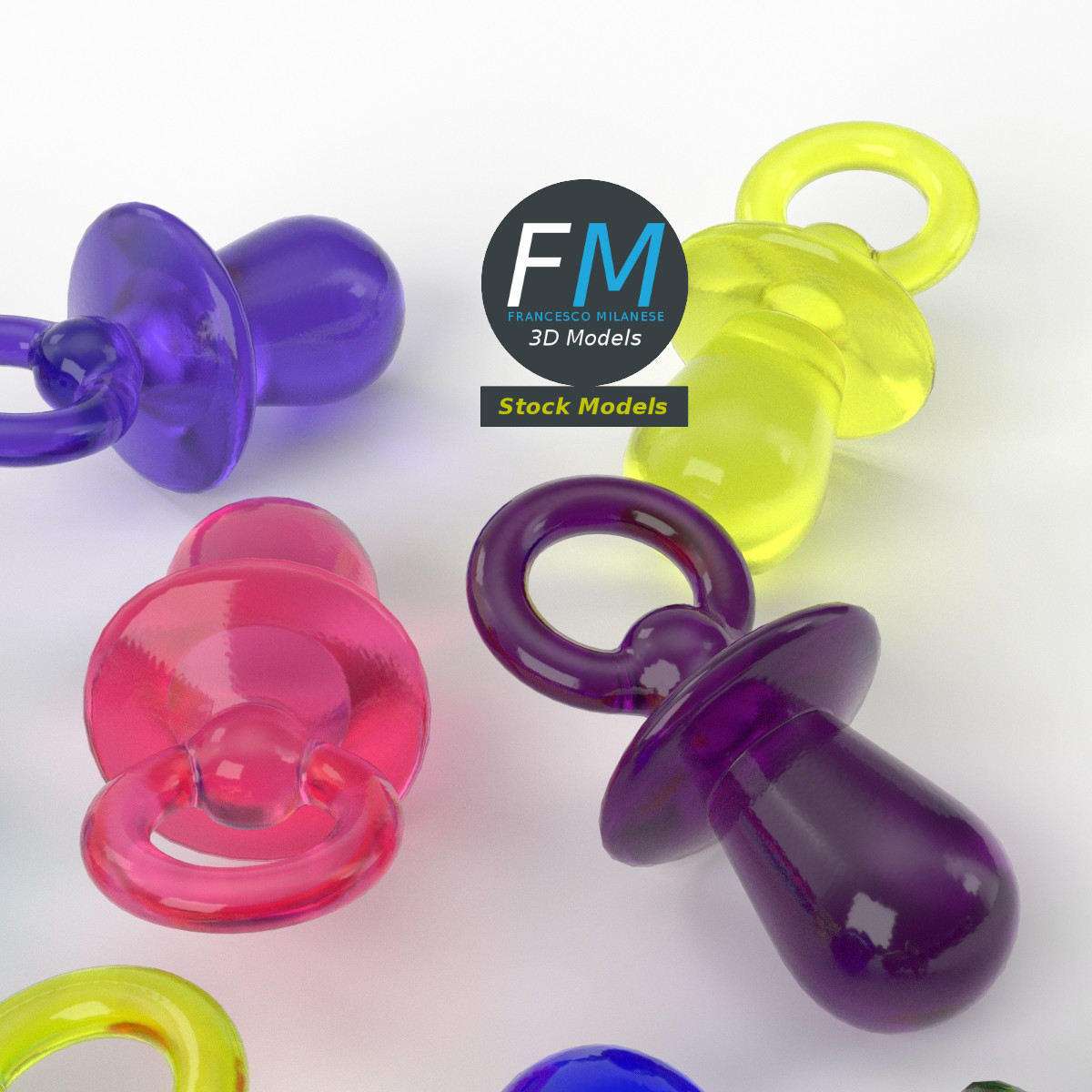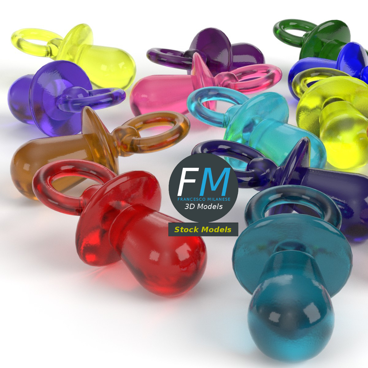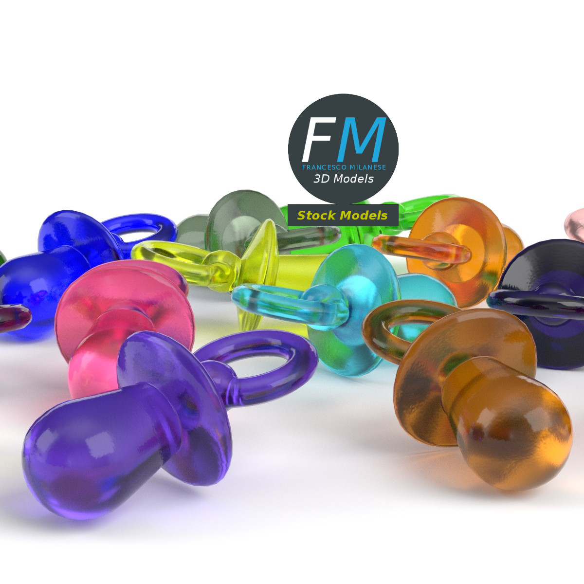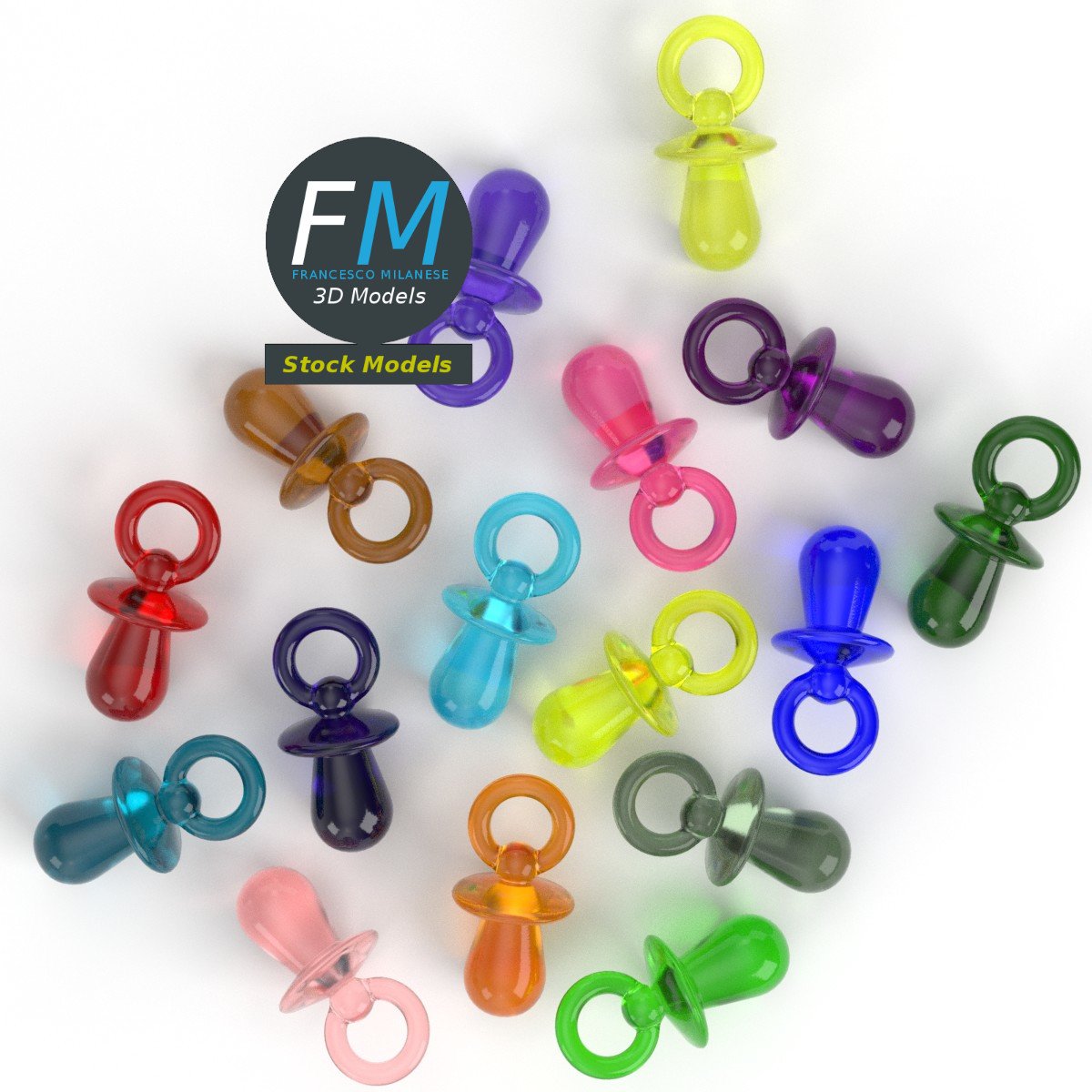 A set of 16 decorative mini pacifiers 3D Model; they were trendy in the late 80s and early 90s. 16 objects sharing the same non overlapping UV Layout map, Material and PBR Textures set. Production-ready 3D Model, with PBR materials, textures, non overlapping UV Layout map provided in the package.