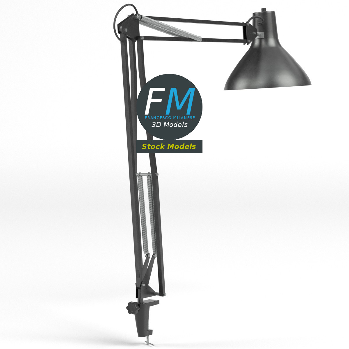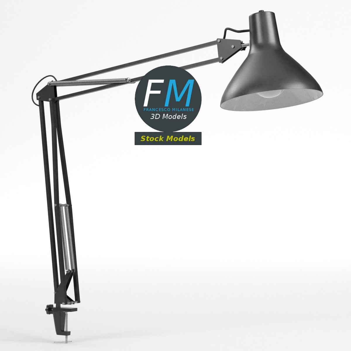 Office desk lamp 3D Model, nr. 5 in my collection. 7 individual objects (clamp, screw, base, 2 arms, case, lamp), sharing the same non overlapping UV Layout map and 2 Materials (frame, emitting light bulb) and PBR Textures sets. Production-ready 3D Model, with PBR materials, textures, non overlapping UV Layout map provided in the package.