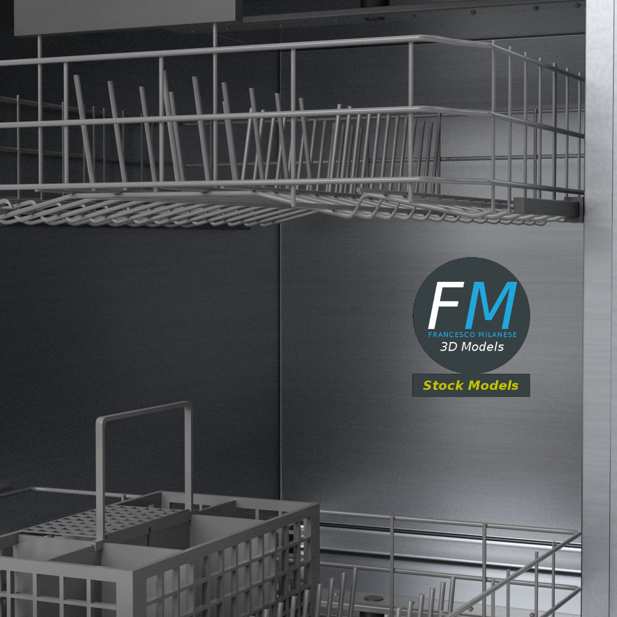 Dishwasher 3D Model. 7 individual objects (case, door, 2 spray arms, 2 trays, kitchenware basket), sharing 2 non overlapping UV Layout map, Materials and PBR Textures sets. Production-ready 3D Model, with PBR materials, textures, non overlapping UV Layout map provided in the package.
