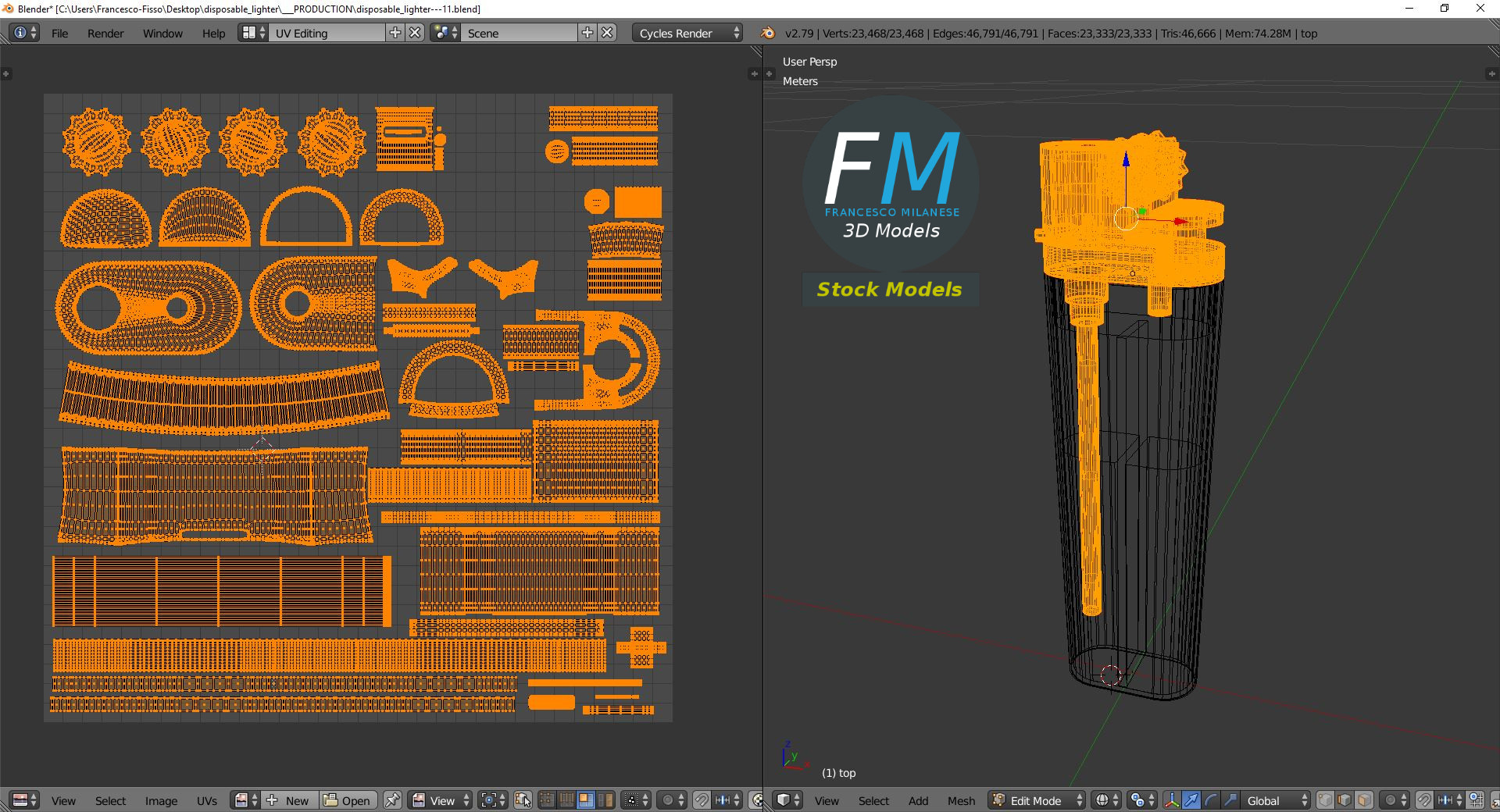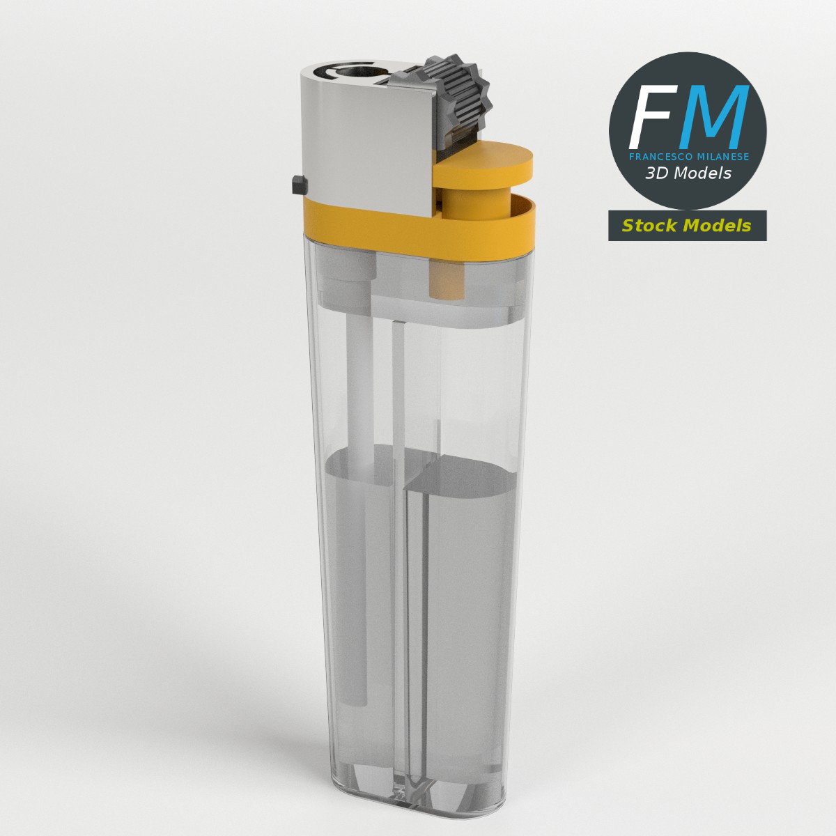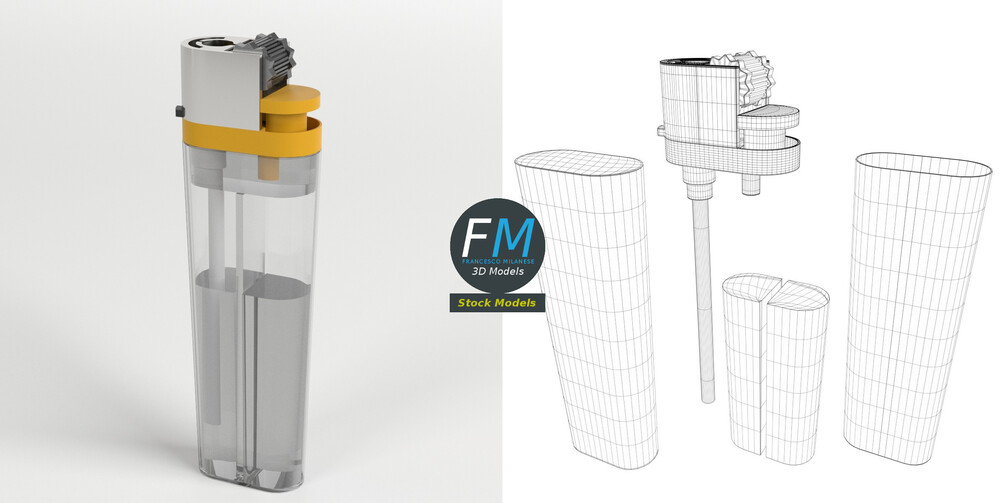 Disposable lighter 3D Model. 3 objects (transparent case, liquid inside, top), parented, each one with its own non overlapping UV Layout map, Material and PBR Textures set. Production-ready 3D Model, with PBR materials, textures, non overlapping UV Layout map provided in the package.