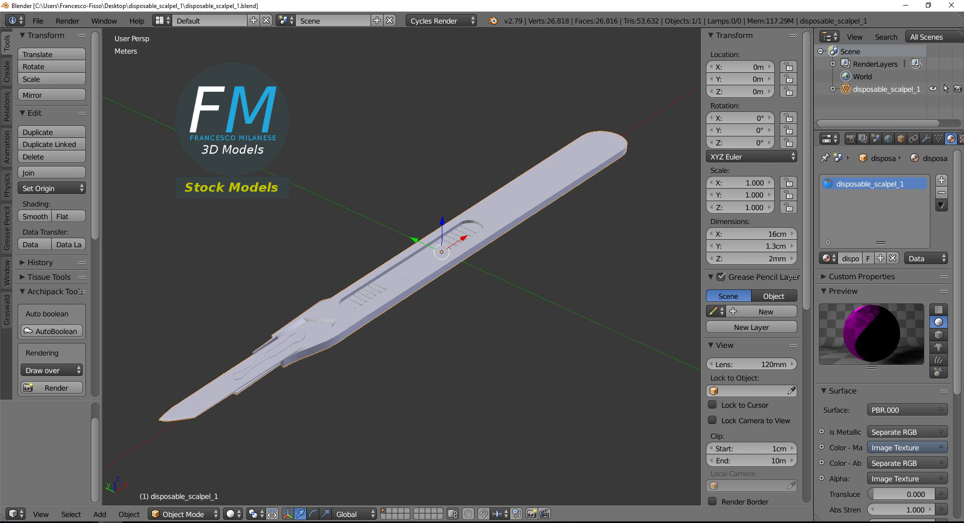 fm3d, game ready, vr, ar, scalpel, lancet, sharp, blade, surgery, dissection, medicine, tool, disposable