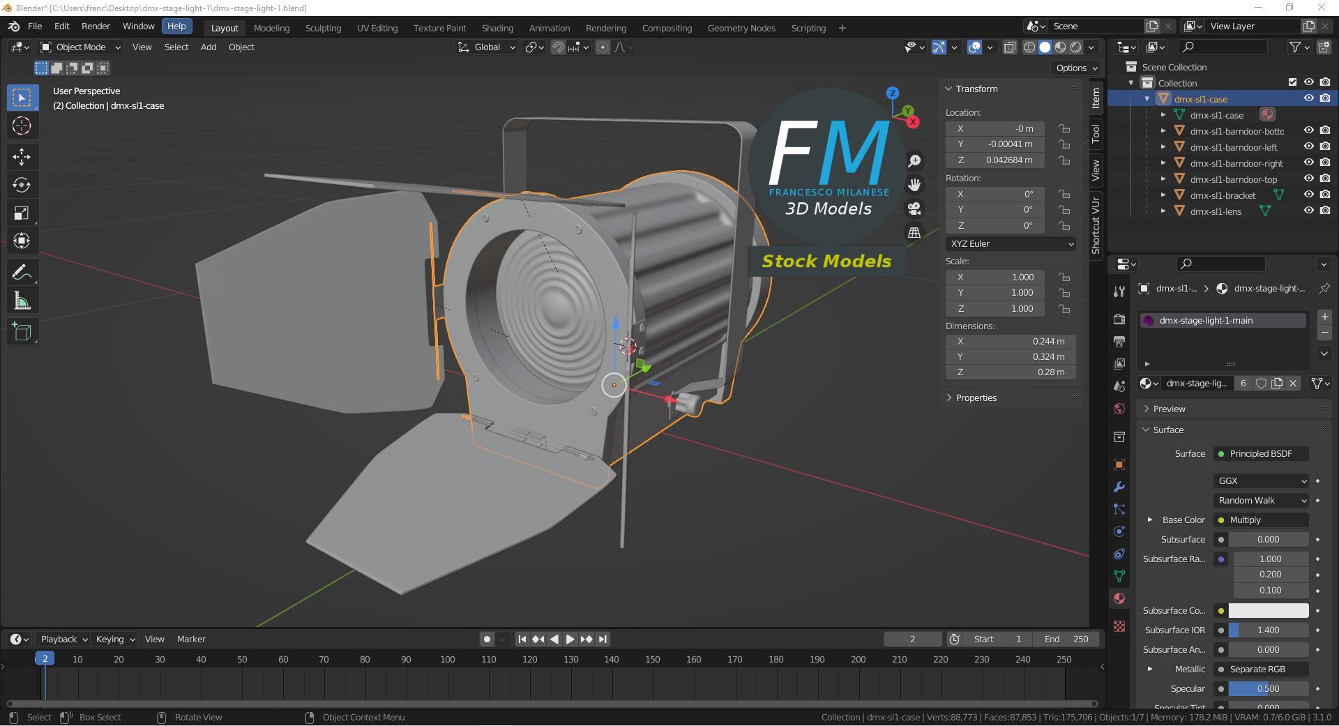 Stage light with DMX equipment, bracket and barndoor 3D Model, nr. 1 in my collection. 7 individual objects (main case, 4 barndoors, 1 bracket, 1 lens; so, you can easily rotate or even animate the barndoors and the bracket), sharing 2 non overlapping UV Layout maps, Materials (so, you can easily assign an emitting Material to the lenses) and PBR Textures set. Production-ready 3D Model, with PBR materials, textures, non overlapping UV Layout map provided in the package.