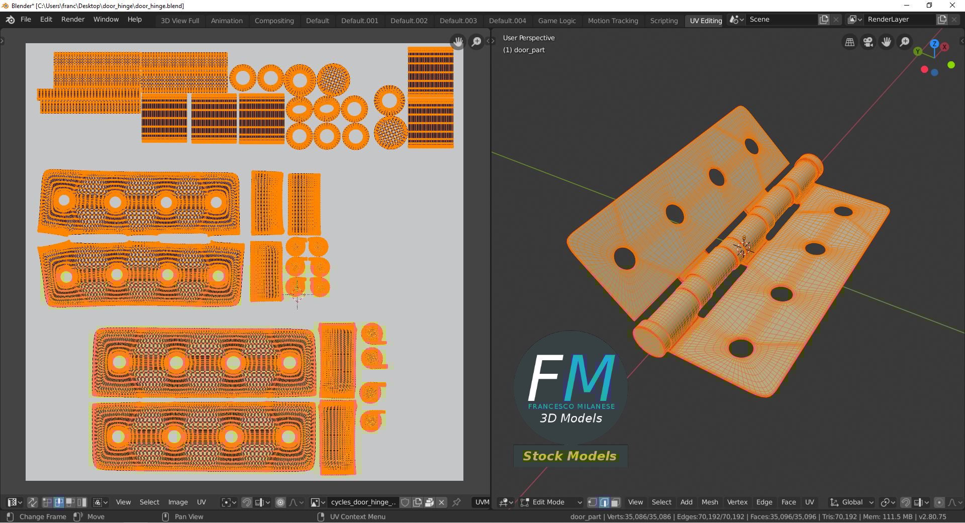 Door hinge 3D Model. 3 individual objects (door part, frame part, latch; so, you can rotate or even animate them), sharing the same non overlapping UV Layout map, Material and PBR Textures set. Production-ready 3D Model, with PBR materials, textures, non overlapping UV Layout map provided in the package.