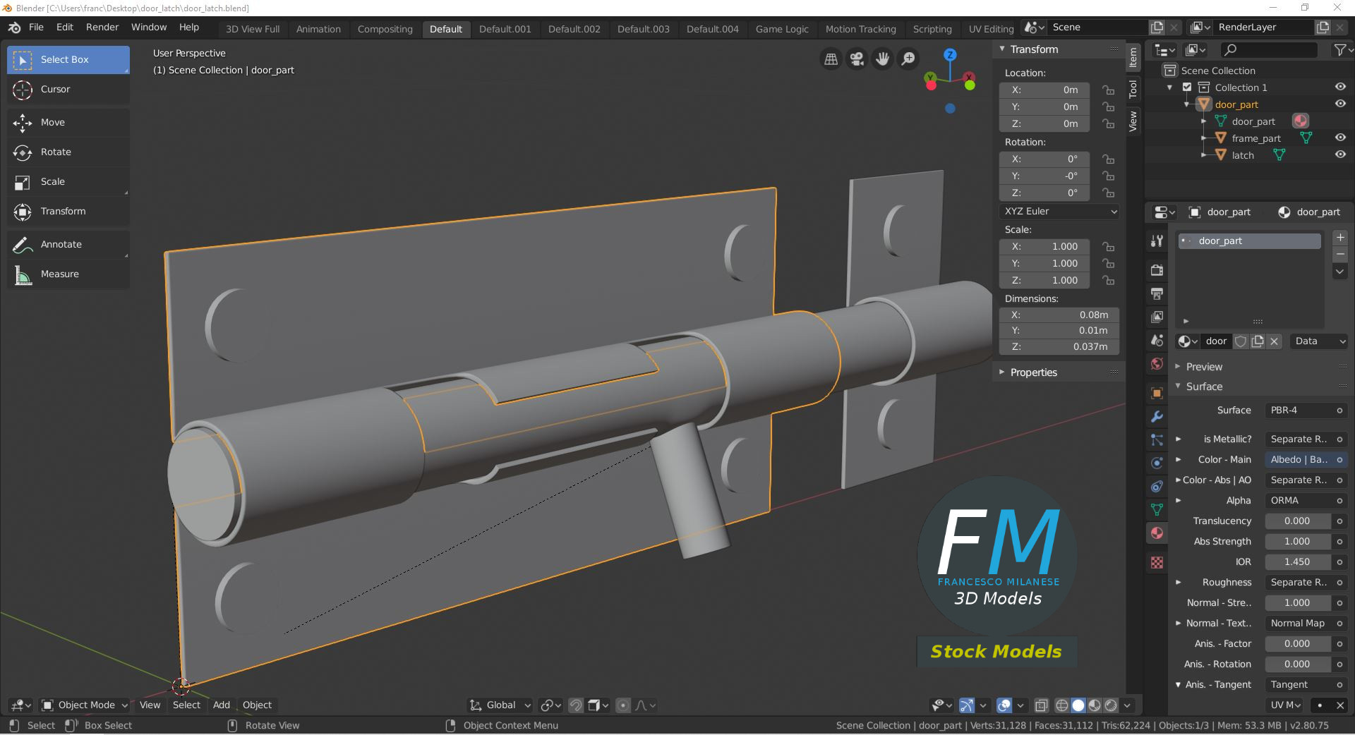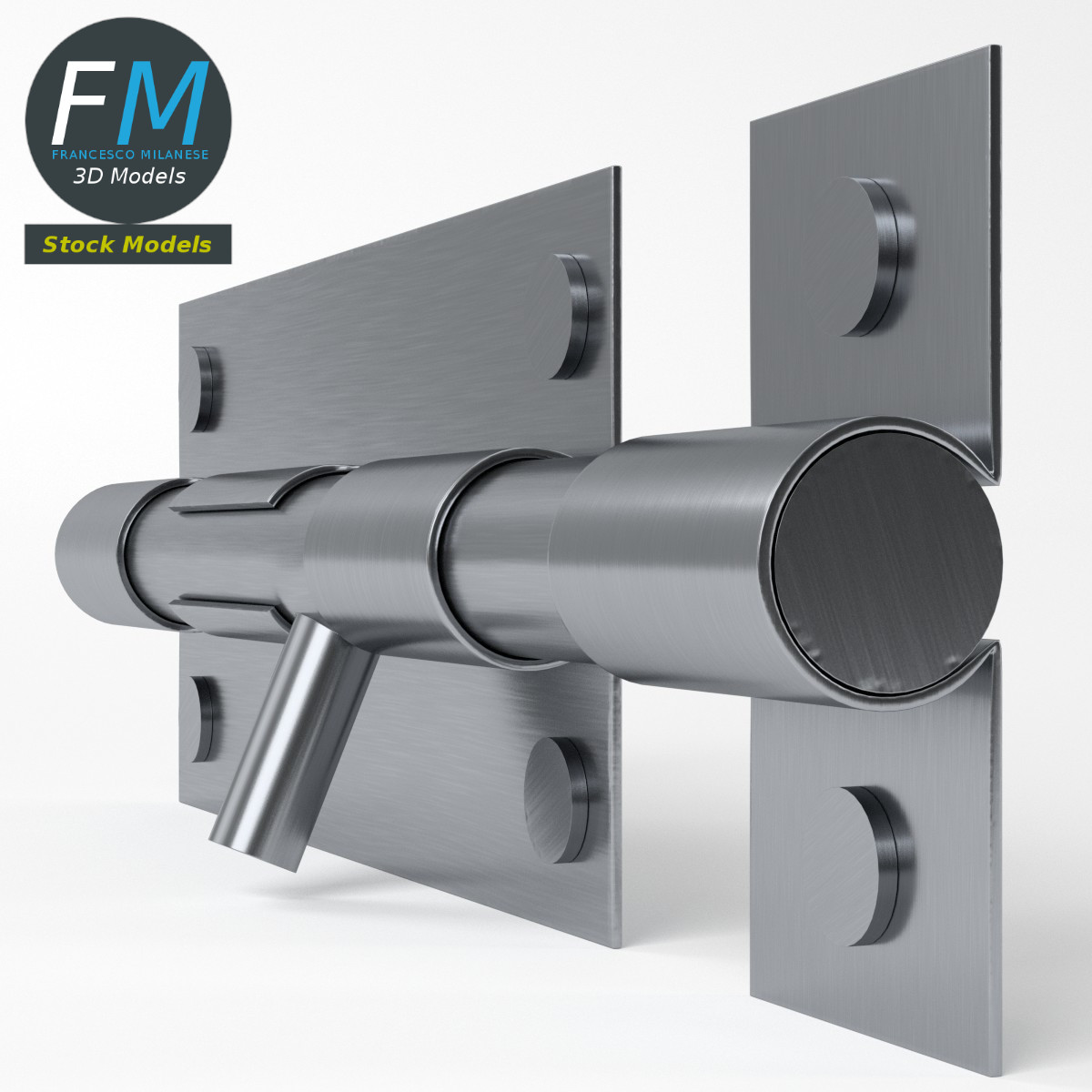Door latch 3D Model. 3 individual objects (door part, frame part, latch; so, you can rotate or even animate them), each one with its own non overlapping UV Layout map, Material and PBR Textures set. Production-ready 3D Model, with PBR materials, textures, non overlapping UV Layout map provided in the package.