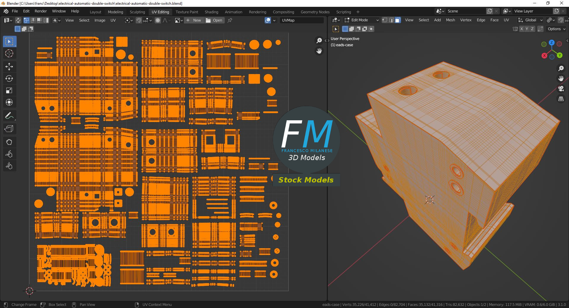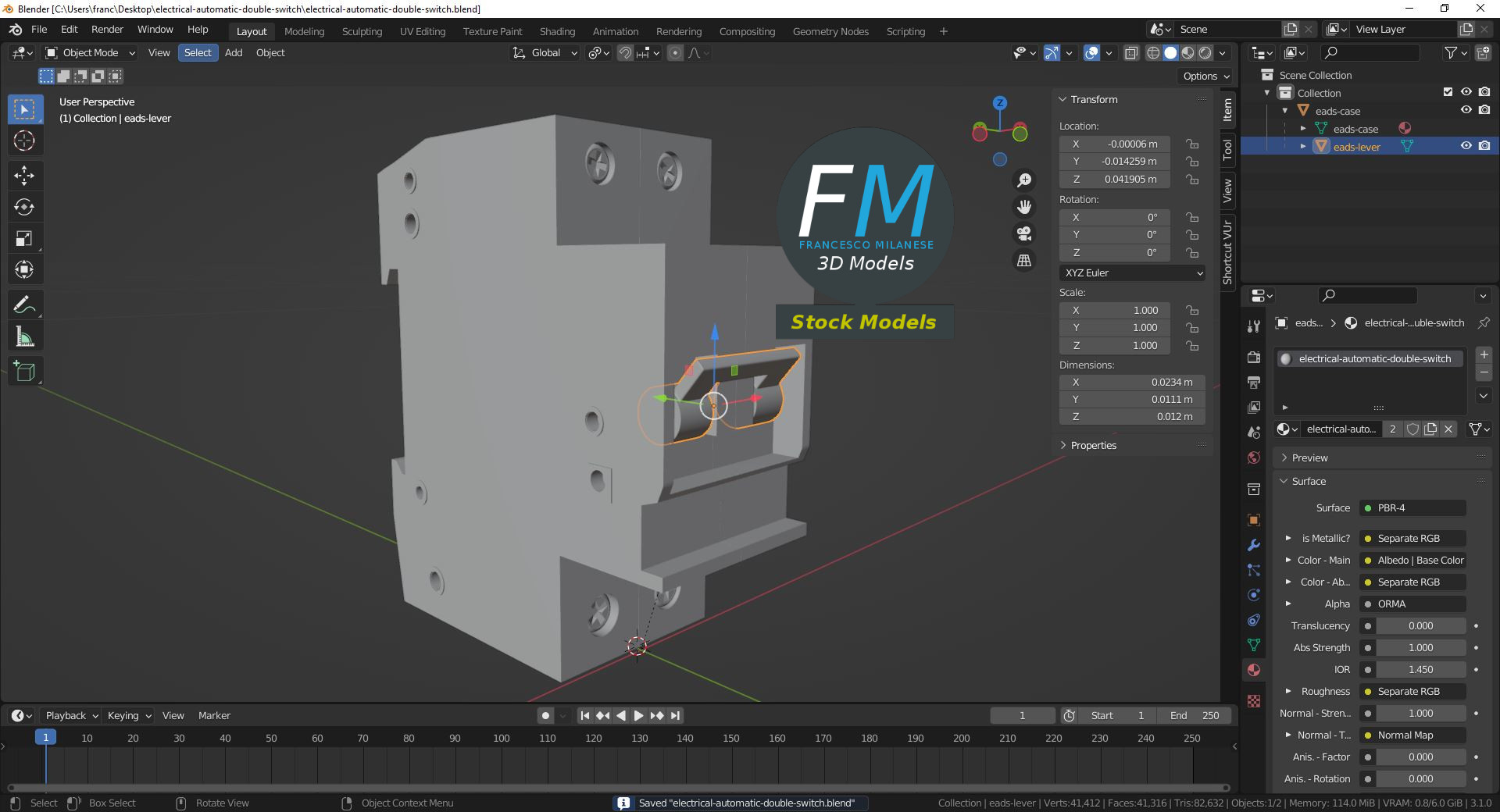 Electrical automatic double switch 3D Model; 2 individual objects (case, lever; so, you can easily rotate or even animate the lever), sharing the same non overlapping UV Layout map, Material and PBR Textures set. Production-ready 3D Model, with PBR materials, textures, non overlapping UV Layout map provided in the package.