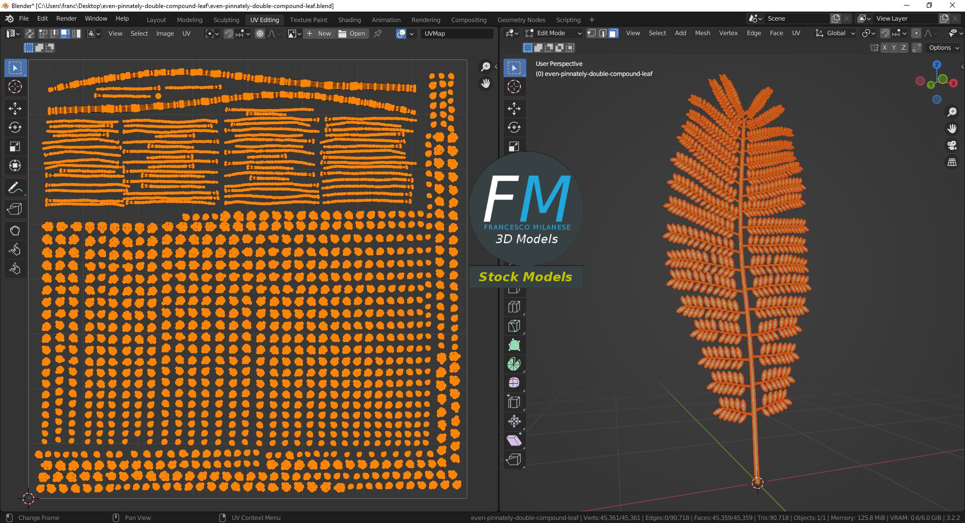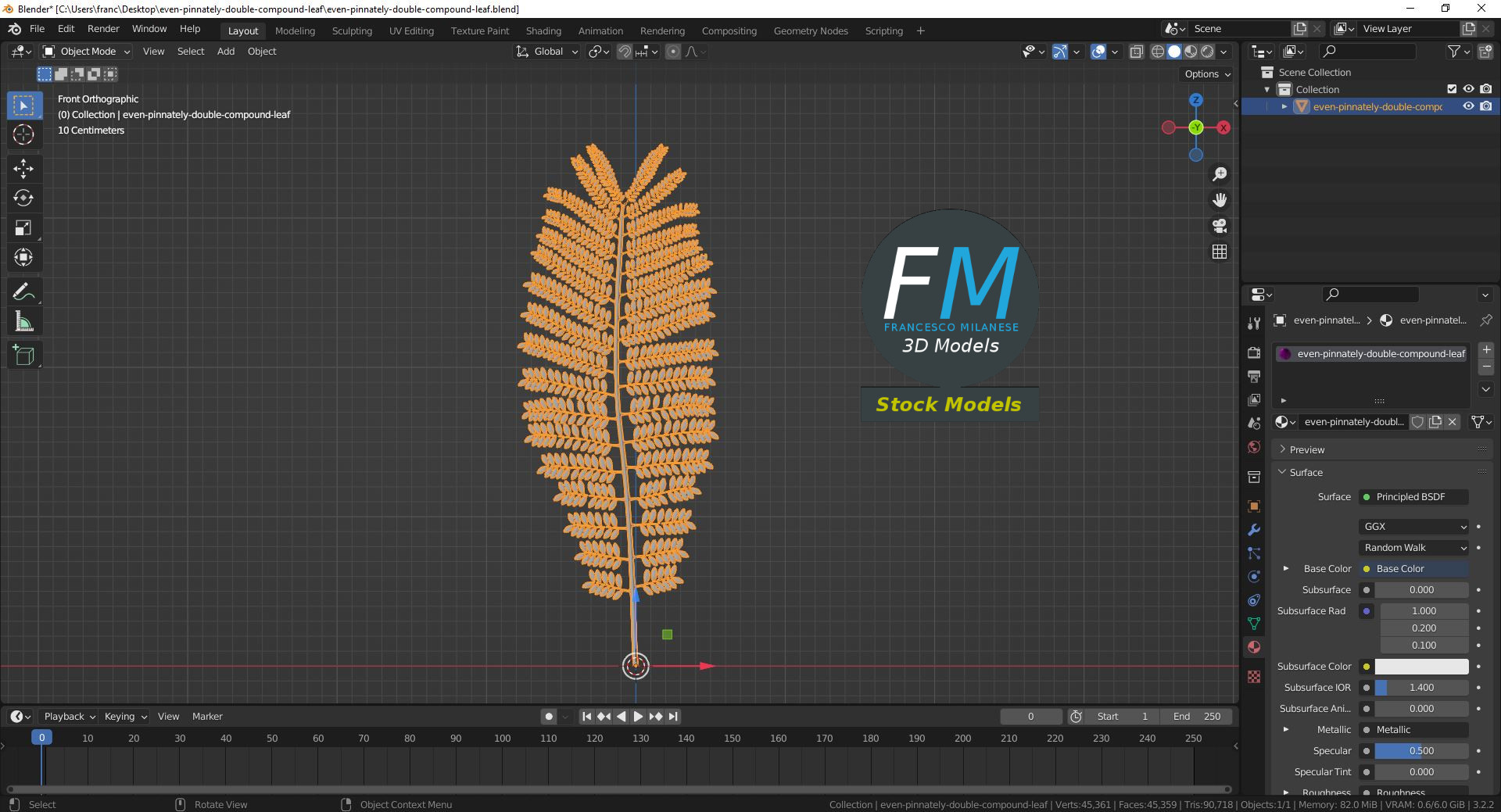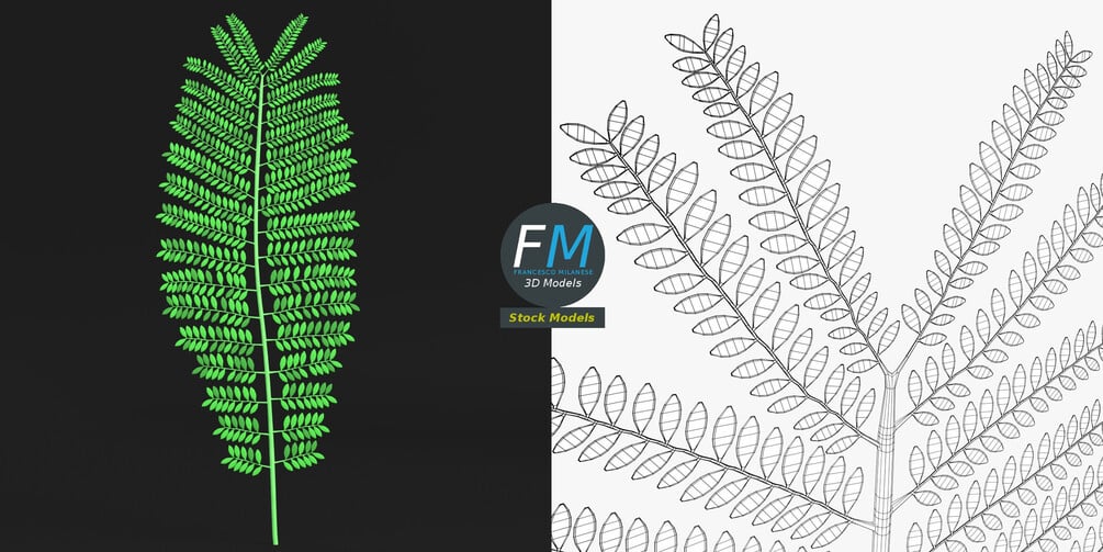 Even pinnately double compound tree leaf 3D Model. Single object with clean UV and topology, so you can easily bend it; useful for trees (e.g.: jacaranda) in long shots. Production-ready 3D Model, with PBR materials, textures, non overlapping UV Layout map provided in the package.