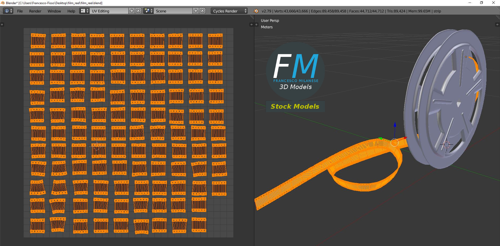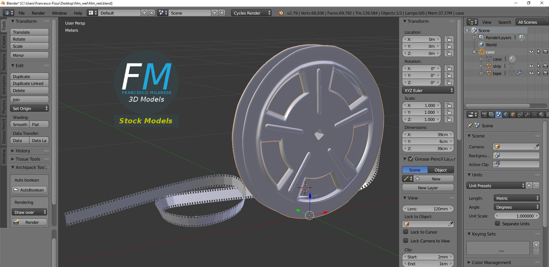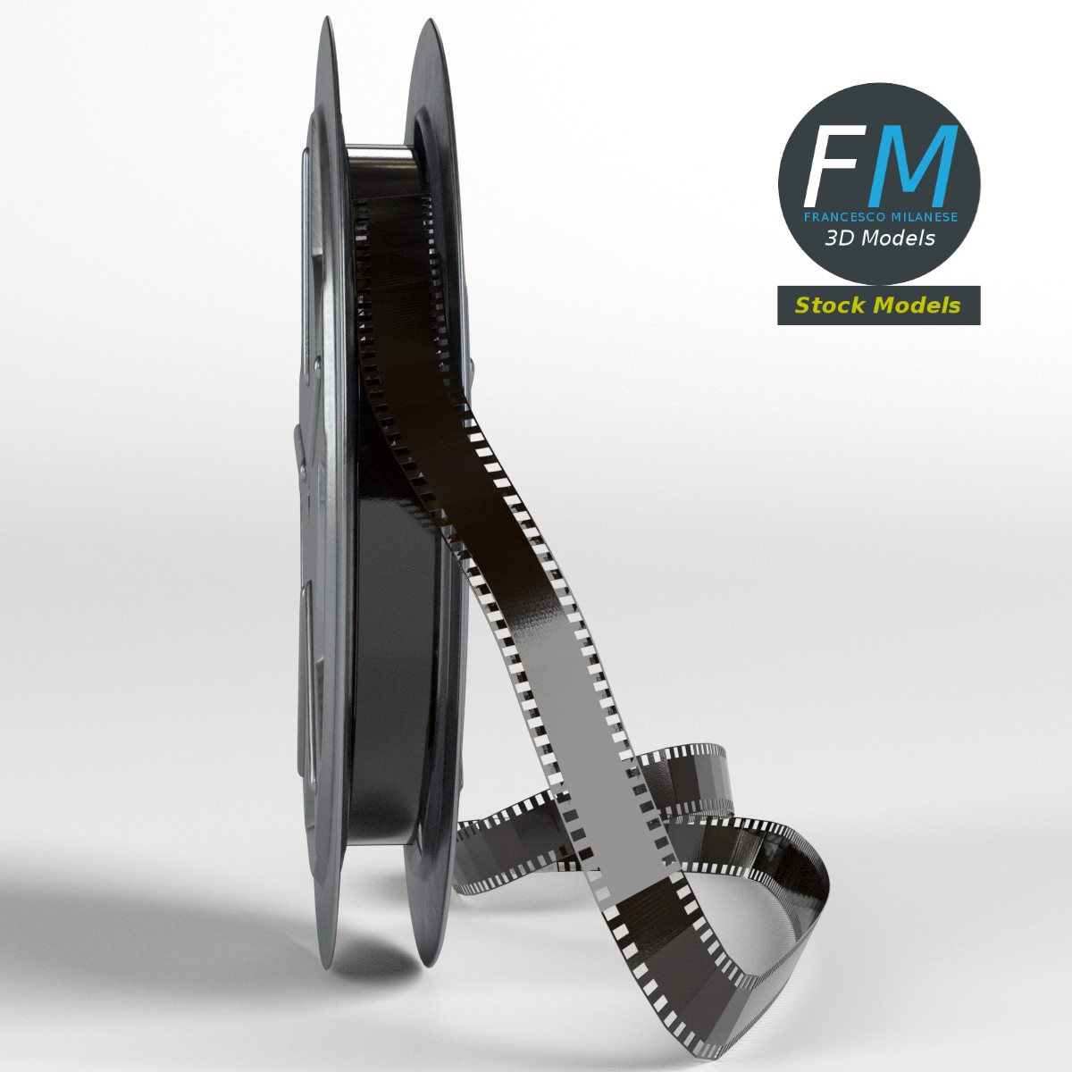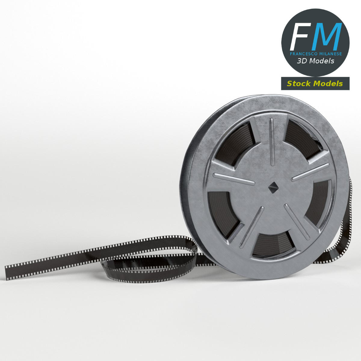 A film reel 3D Model. 3 objects (case, strip, tape), parented, each one with its own non overlapping UV Layout map, Material and PBR Textures set. Production-ready 3D Model, with PBR materials, textures, and non overlapping UV Layout map provided in the package.