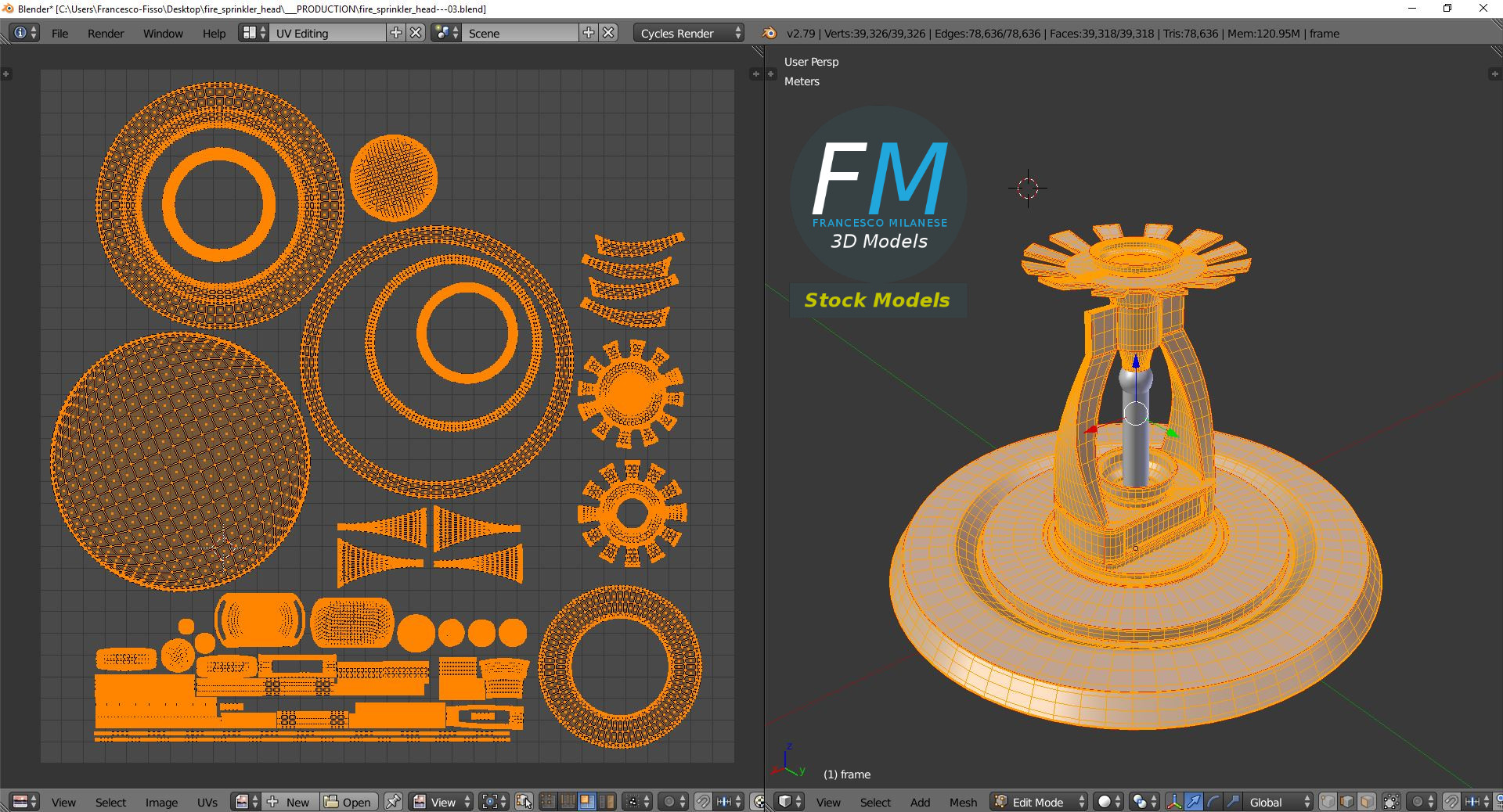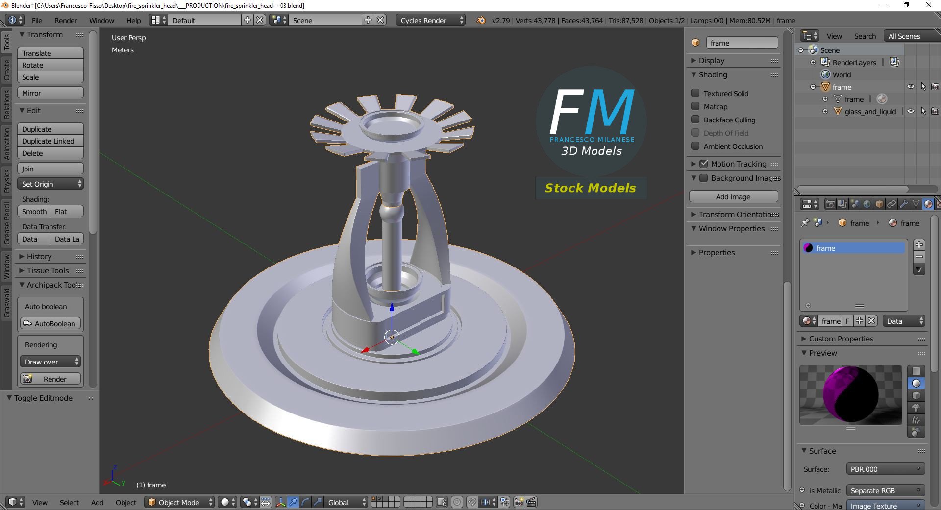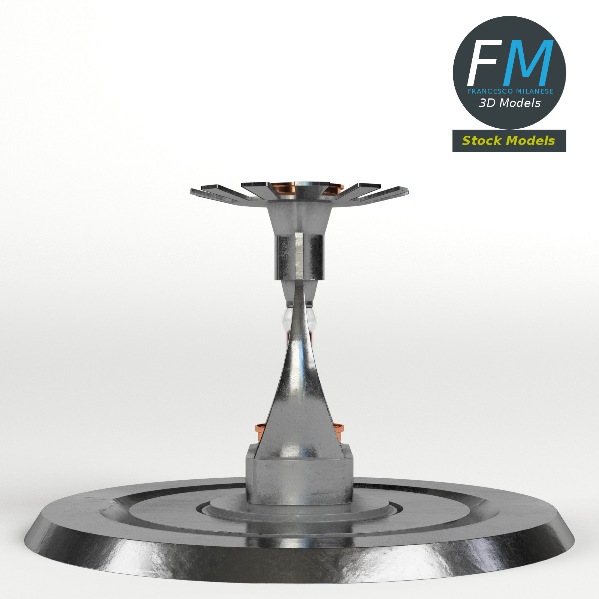 Fire sprinkler head 3D Model. 2 objects (frame, glass with liquid), each one with its own non overlapping UV Layout map, Material and PBR Textures set. Production-ready 3D Model, with PBR materials, textures, non overlapping UV Layout map provided in the package.
