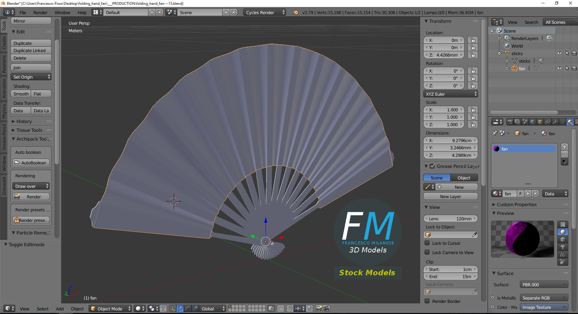 Folding handheld fan 3D Model. 2 objects (fan, sticks), parented, each one with its own non overlapping UV Layout map, Material and PBR Textures set. Production-ready 3D Model, with PBR materials, textures, non overlapping UV Layout map provided in the package.