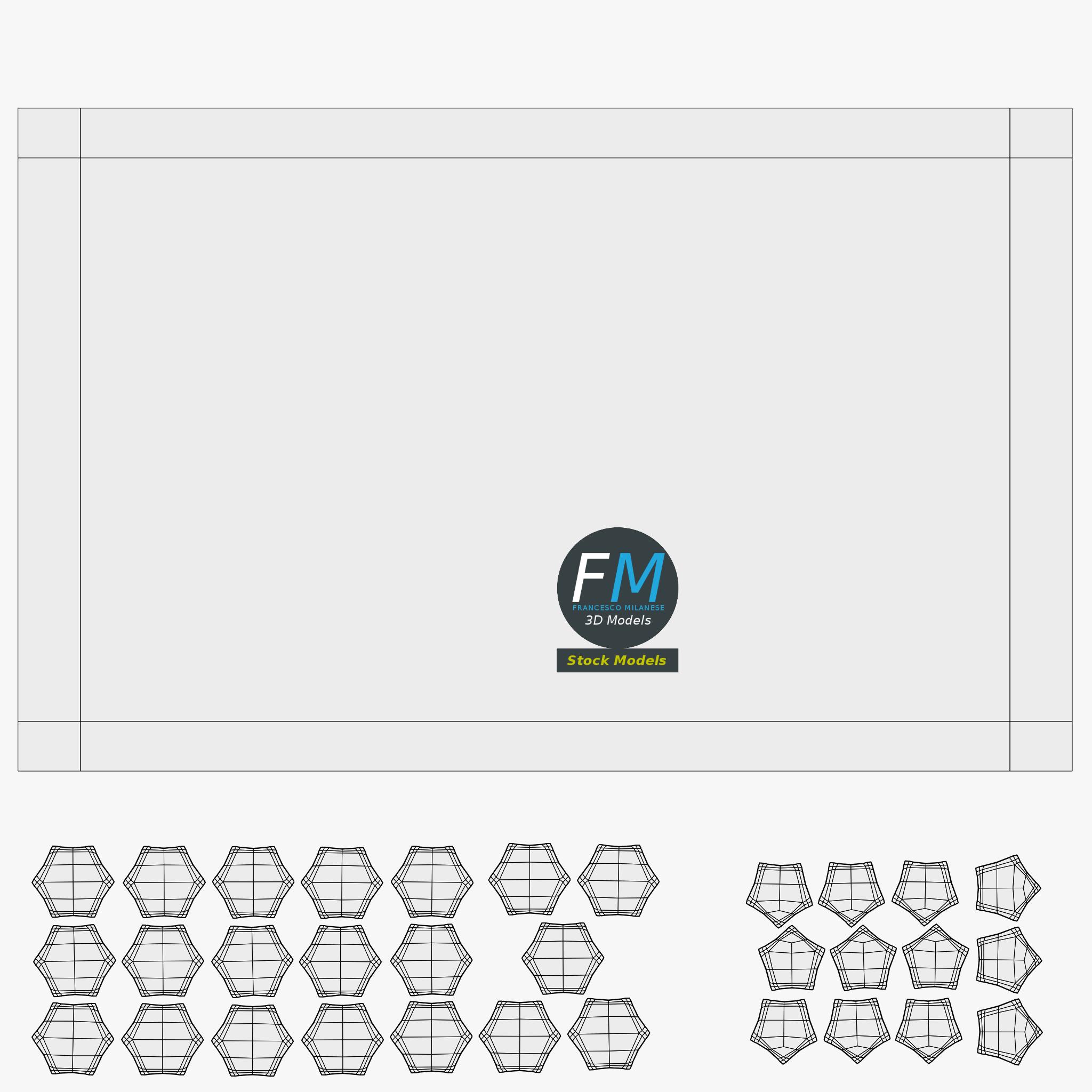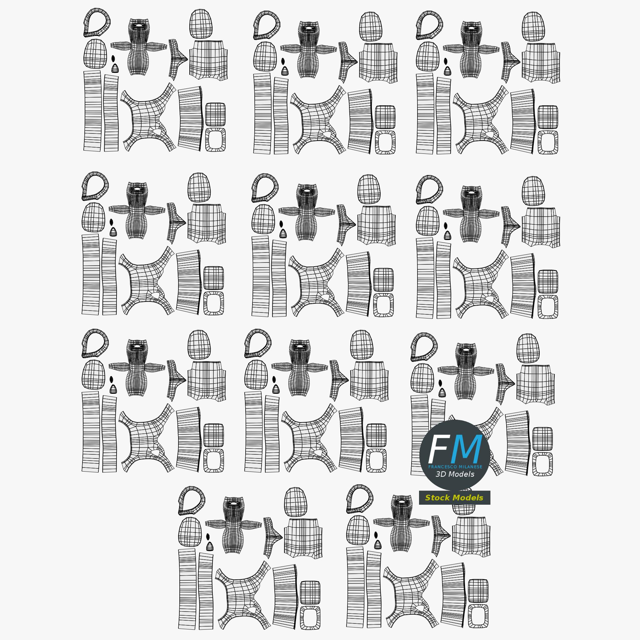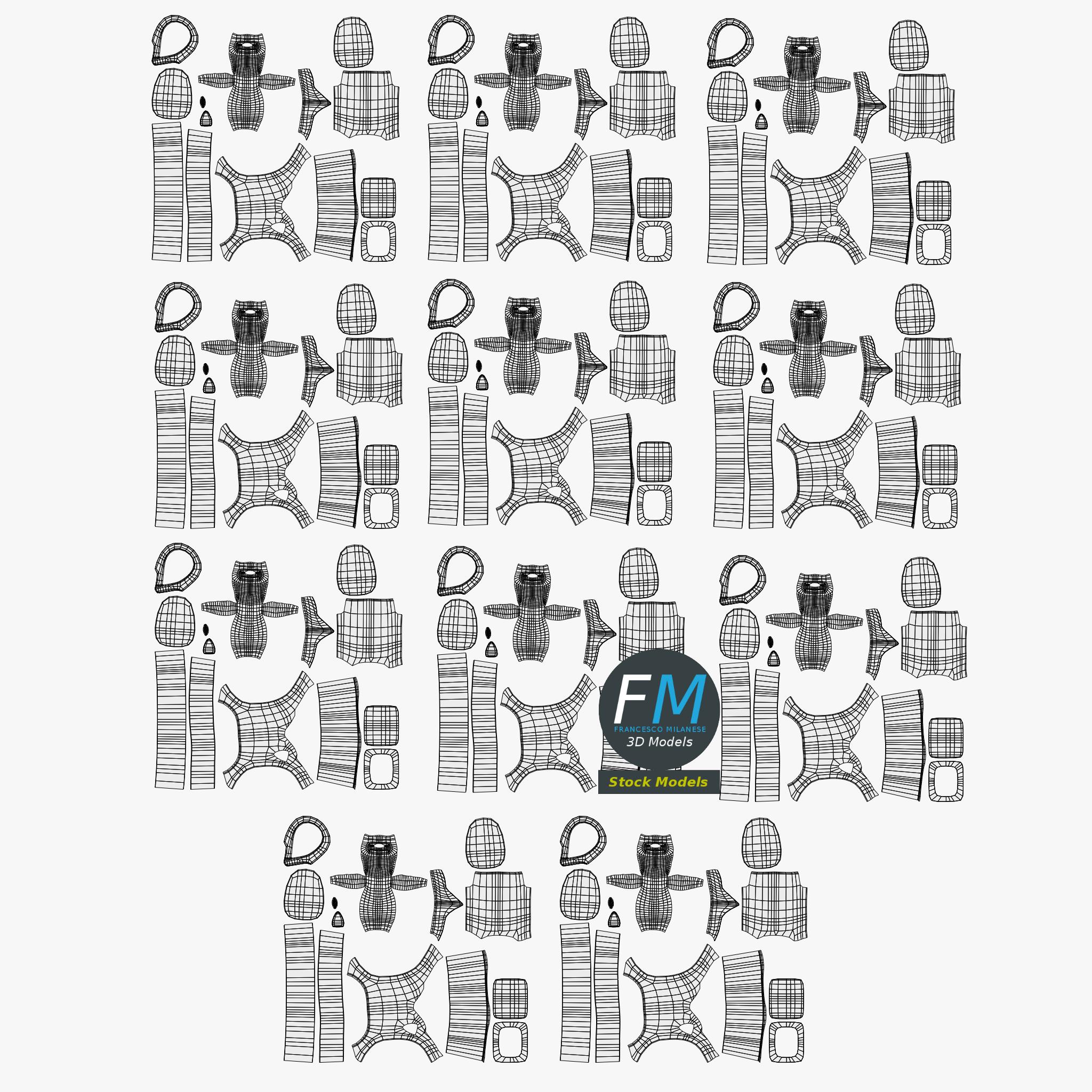 Easily customizable: UV unwrapped geometries; UV Layout maps provided in the package as png with alpha images.