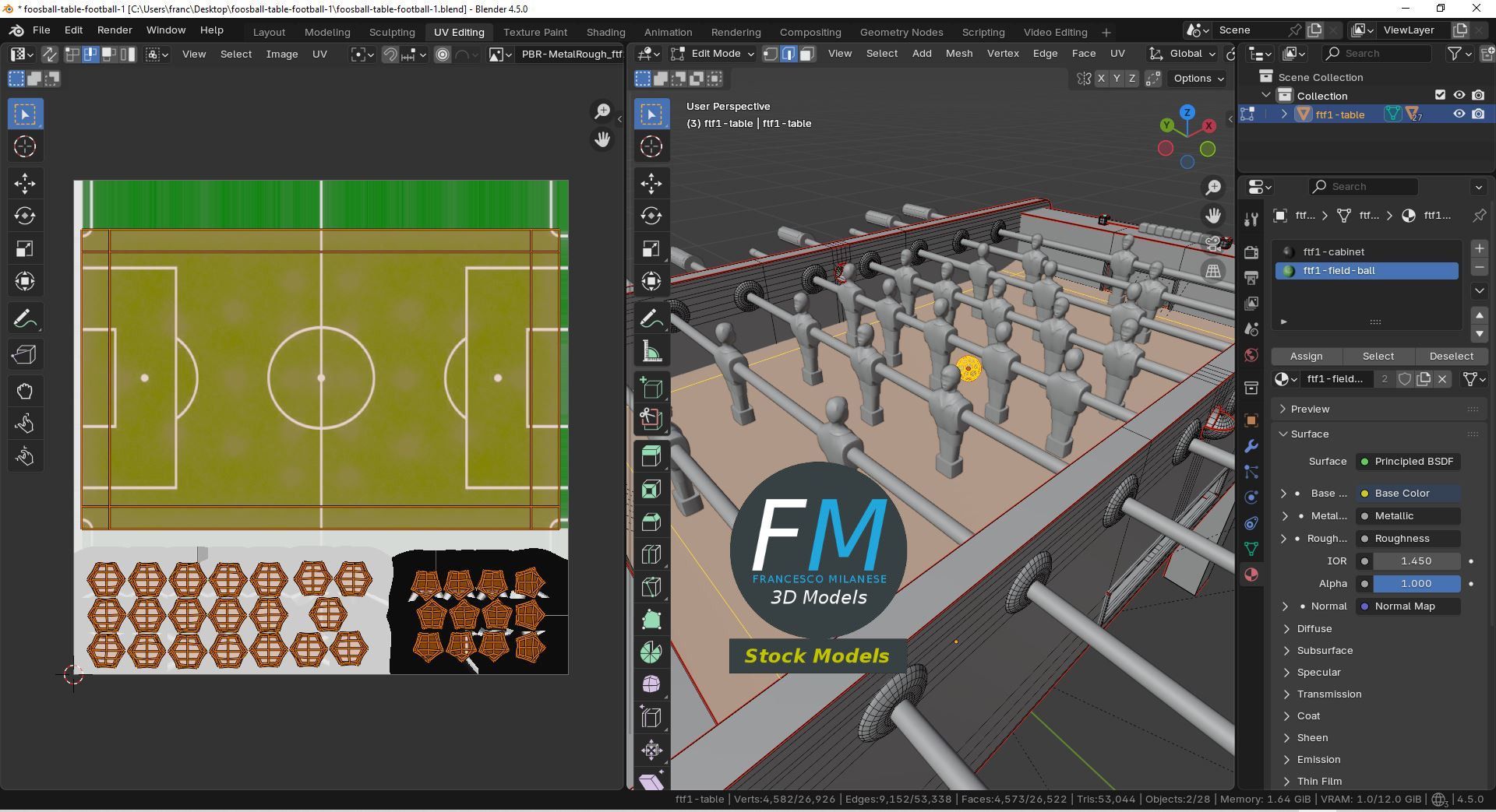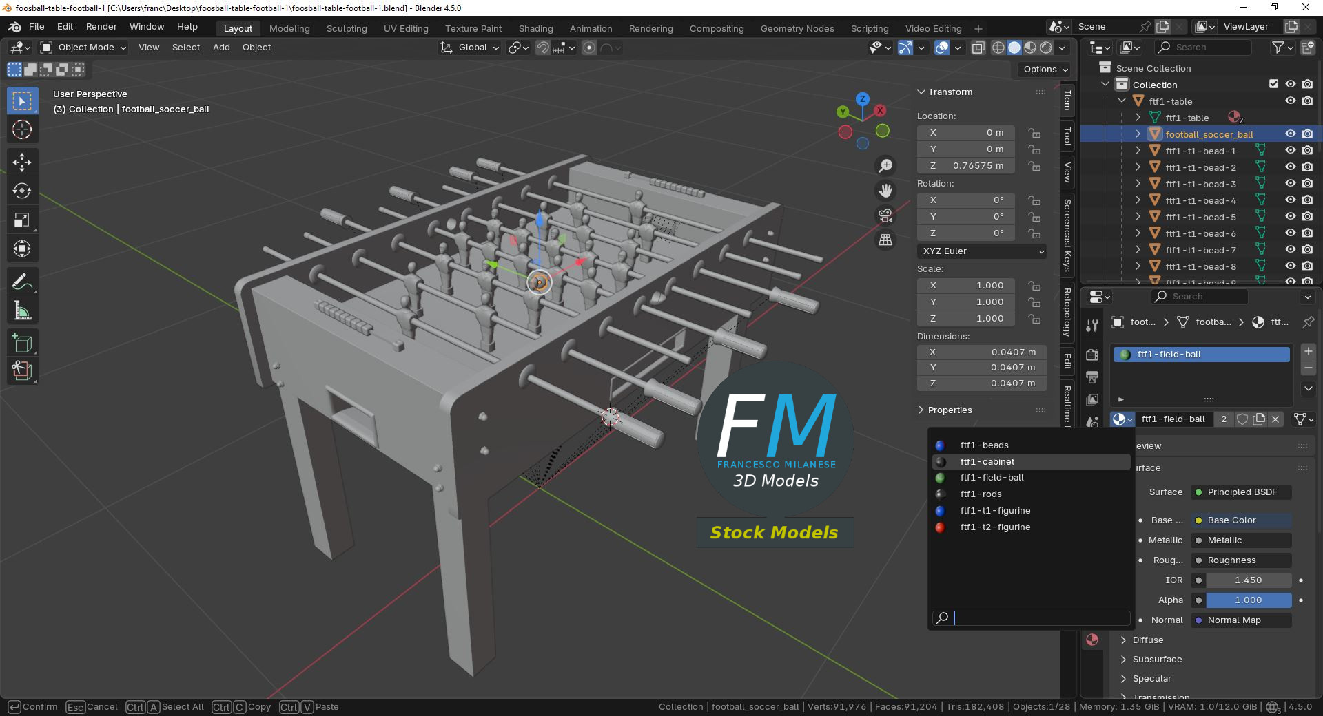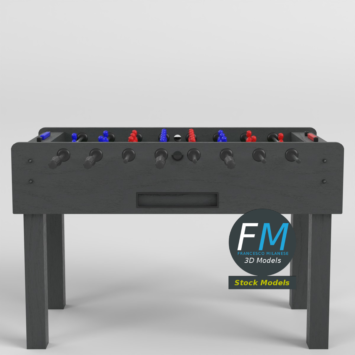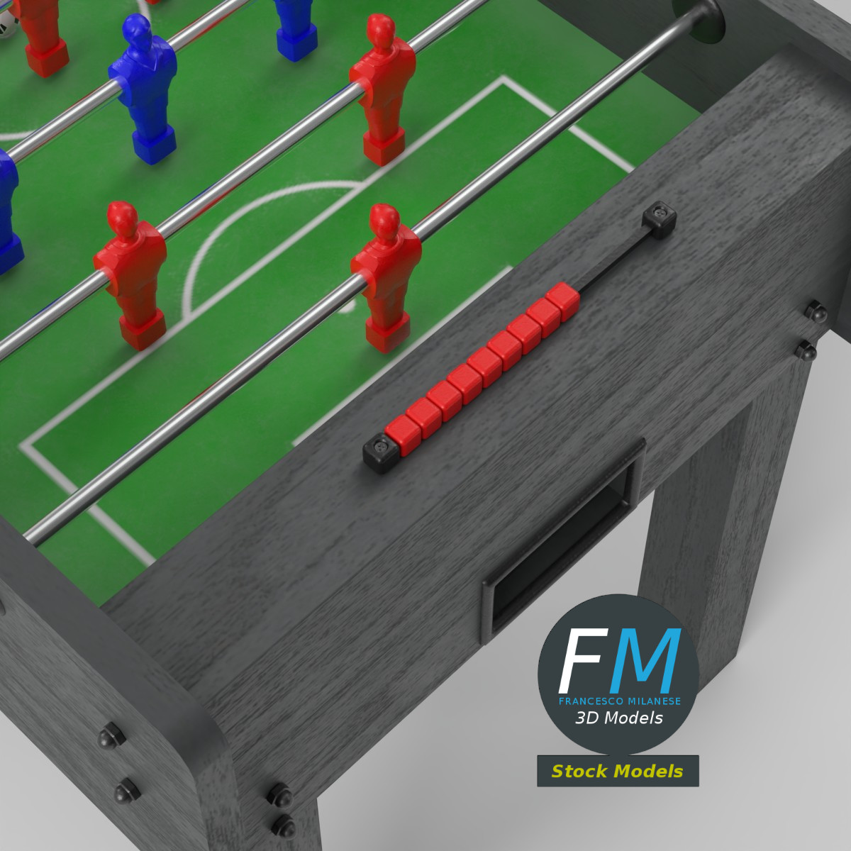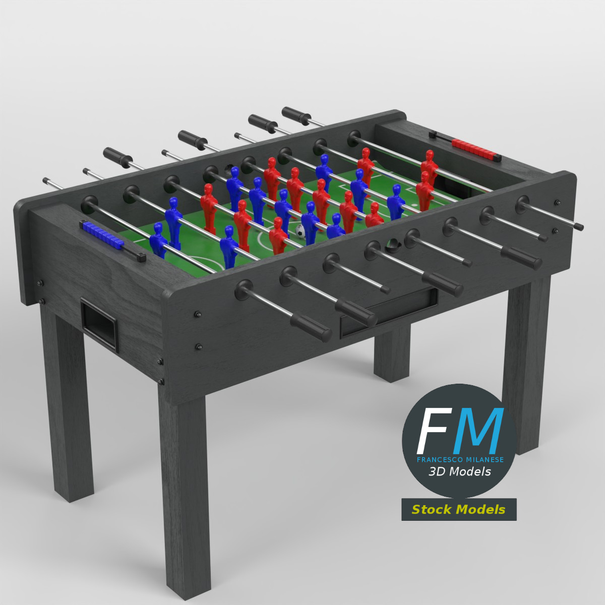 Foosball table football 3D Model, nr. 1 in my collection, home version (no coin acceptor). 28 objects (1 cabinet, 1 ball, 8 rods, 18 score beads; you can easily rotate the rods or move the ball or the beads), sharing 6 Materials (beads, cabinet, field and ball, rods, team 1 figurines, team 2 figurines) with PBR Textures sets and non overlapping UV Layouts. Production-ready 3D Model with non overlapping UV Layout map provided in the package. PBR Materials and Textures (Metallic Workflow: Base Color, Metallic, Roughness, Normal) embedded in the Blend, FBX, and GLB files.