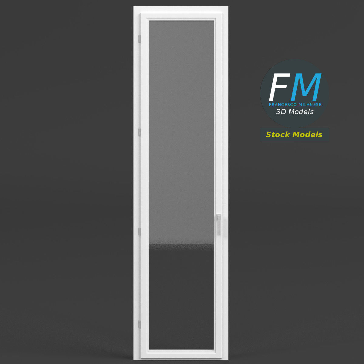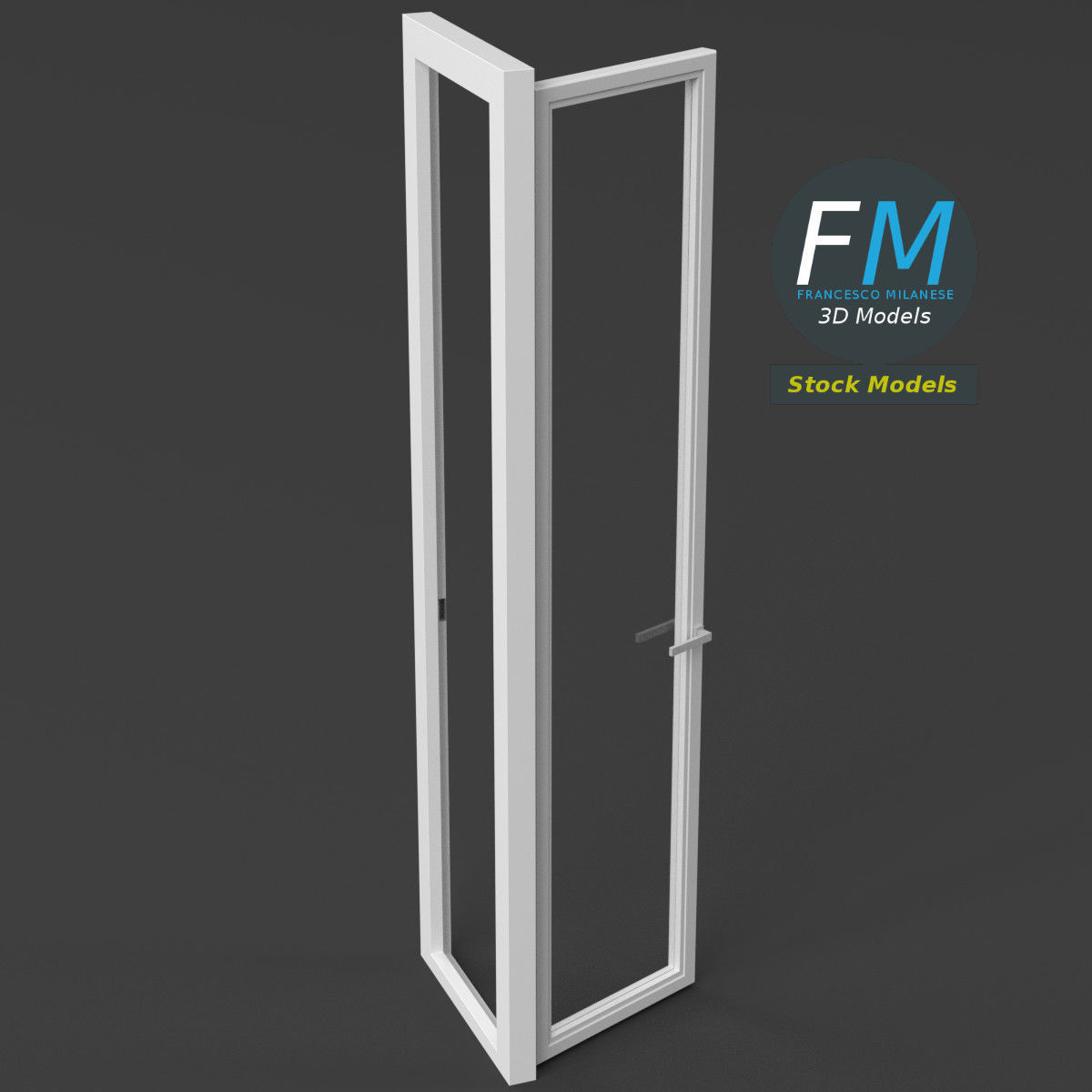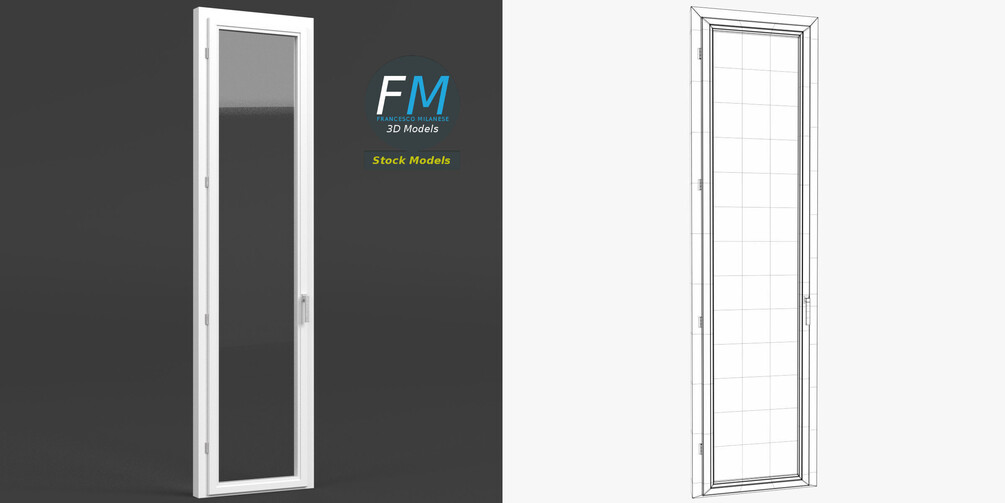 French window 3D Model. 4 individual objects (frame, door frame, glass, handle; so, you can easily rotate or even animate them --- see preview images), sharing the same non overlapping UV Layout map, 2 Materials (glass, frames) and PBR Textures sets.
