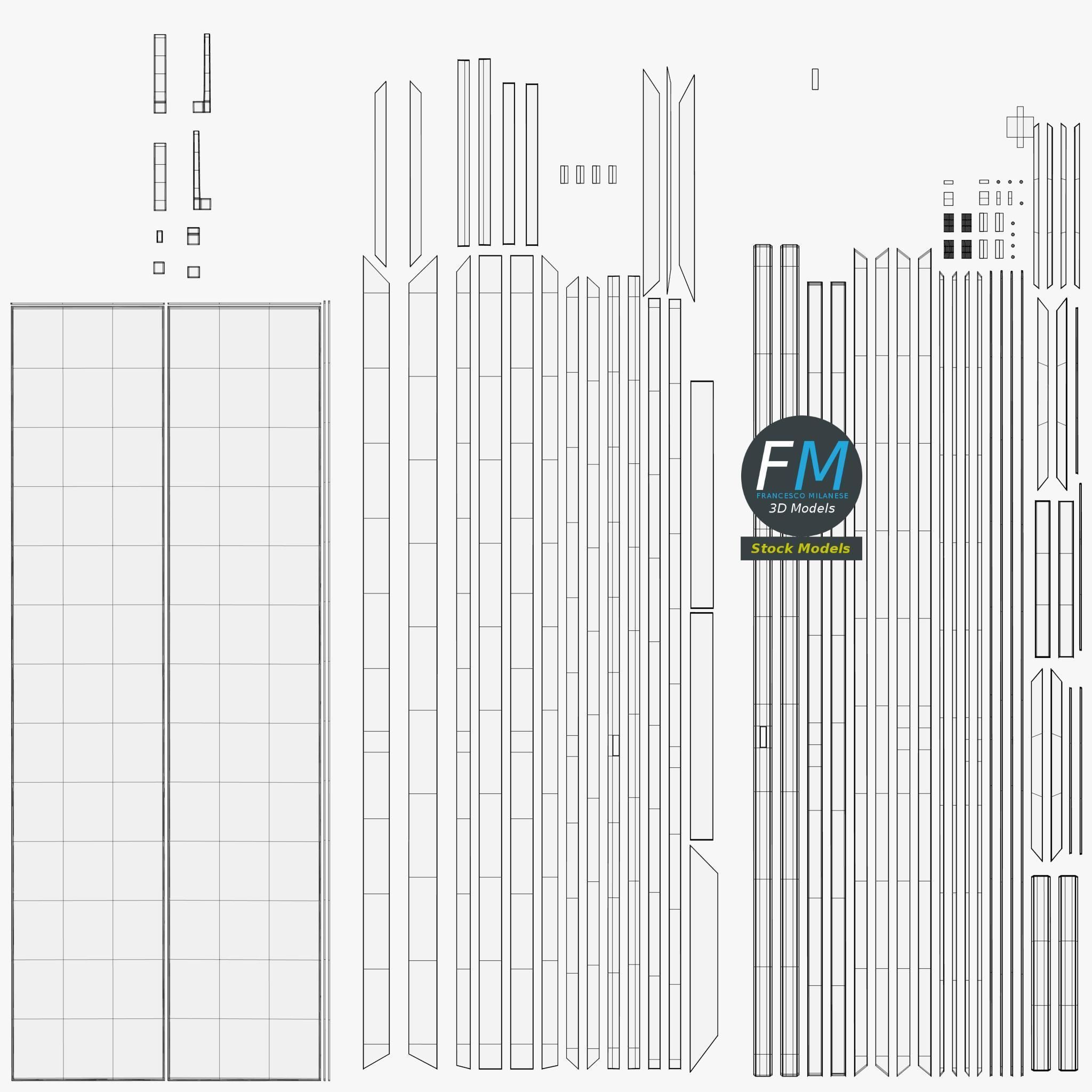 * other images: UV layouts (at least one). Formats included: FBX, OBJ; scenes: BLEND (with Cycles / Eevee PBR Materials and Textures); other: png with Alpha. 4 Objects (meshes), 2 PBR Materials, UV unwrapped (non overlapping UV Layout map provided in the package); UV-mapped Textures. UV Layout maps and Image Textures resolutions: 2048x2048; PBR Textures made with Substance Painter. Polygonal, QUADS ONLY (no tris/ngons); 8222 vertices, 8192 quad faces (16384 tris). Real world dimensions; scene scale units: cm in Blender (that is: Metric with 0.01 scale). Uniform scale object (scale applied in Blender).