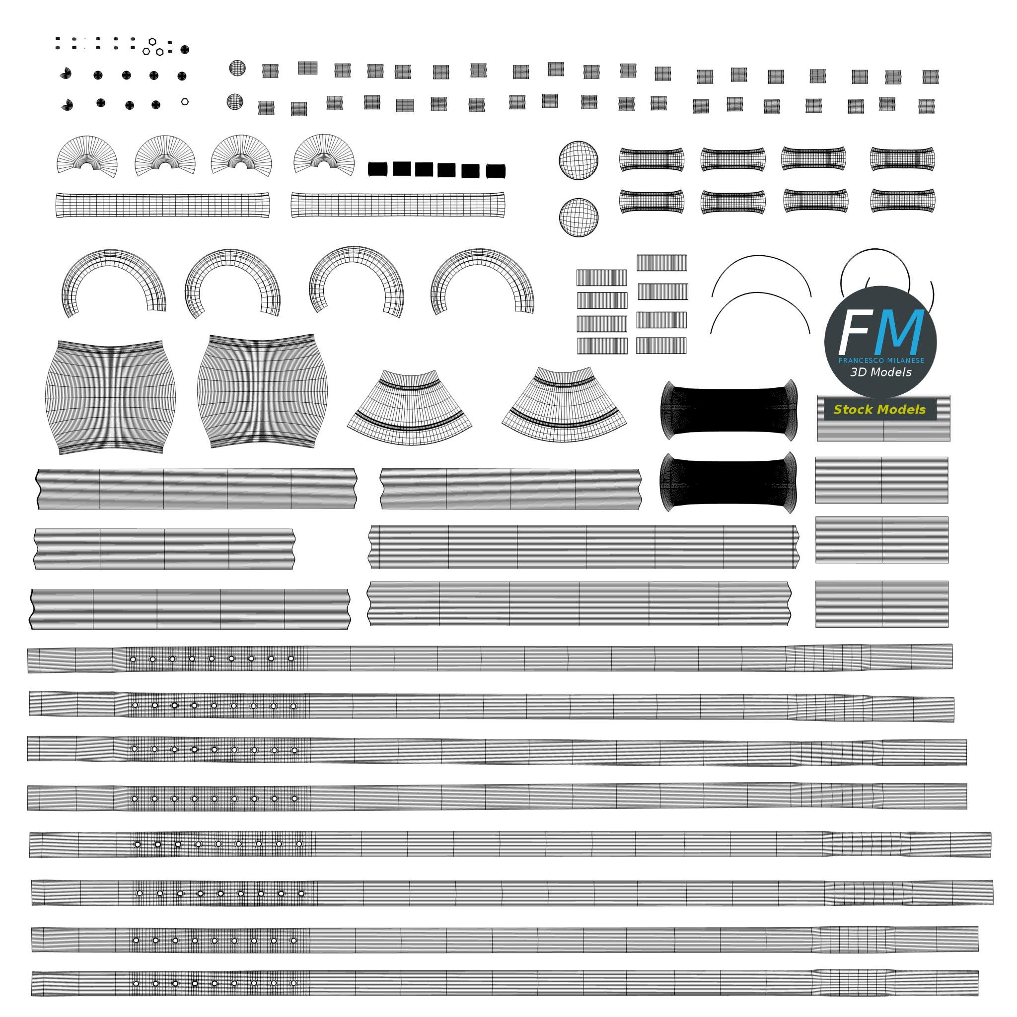 Easily customizable: UV unwrapped geometries, so you can create new Textures (or modify the existing ones) using the UV Layout maps provided in the package (as png with alpha).