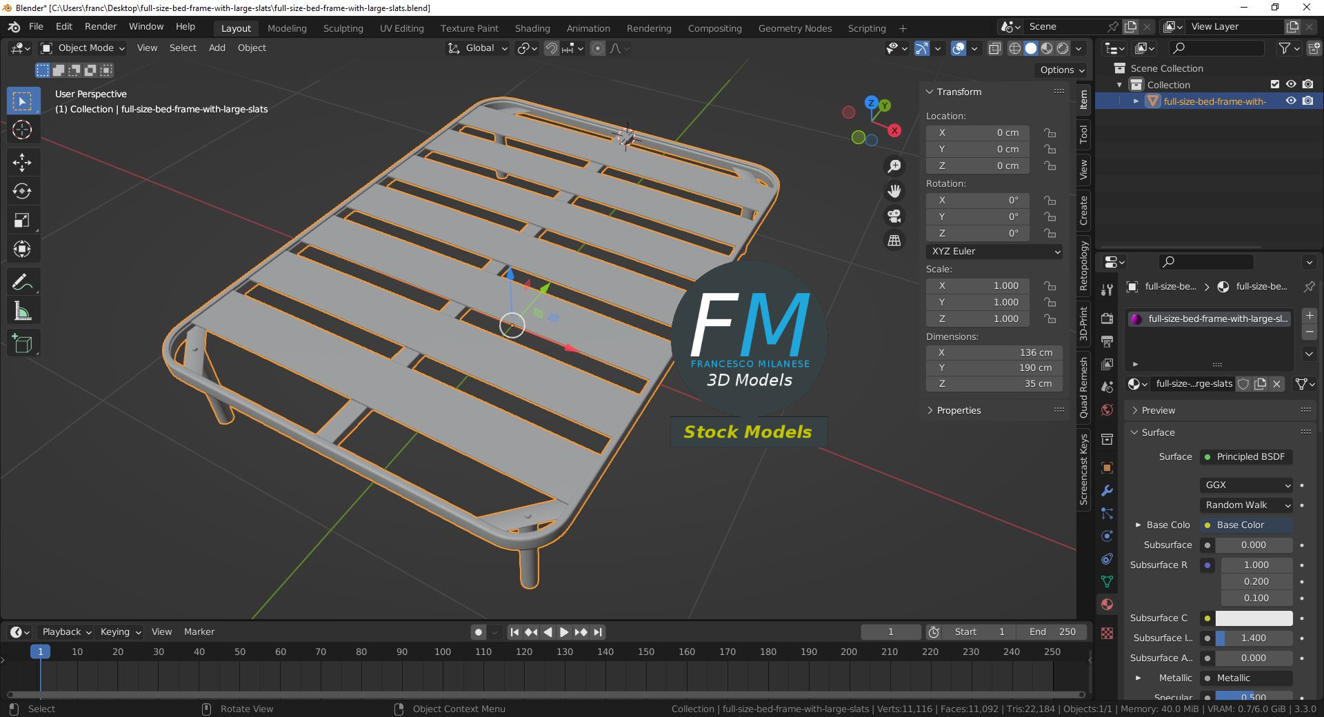 Sketchfab 3D preview: https://sketchfab.com/3d-models/full-size-bed-frame-with-large-slats-0668db6a85ae4882bbecccb8c67a8510