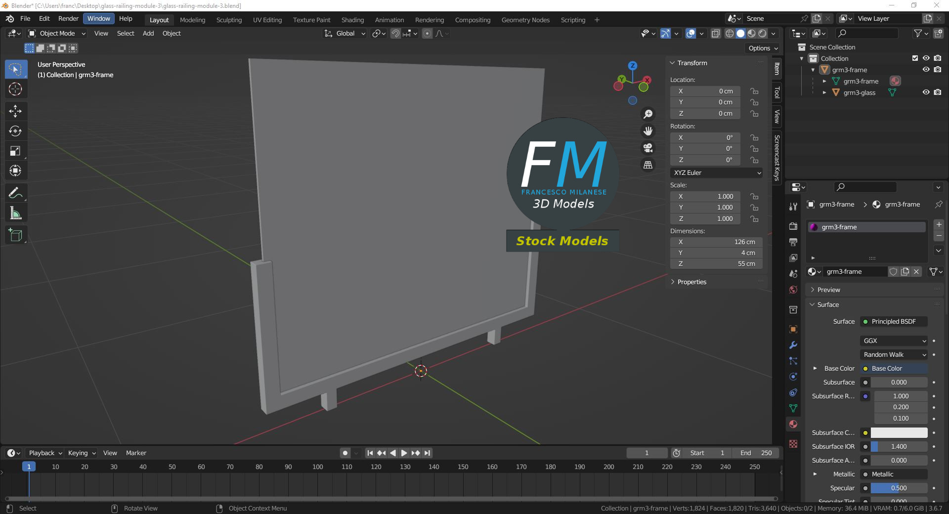 Glass railing module 3D Model, nr. 3 in my collection. 2 individual objects (frame, glass), each one with its own non overlapping UV Layout map, Material and PBR Textures set. Production-ready 3D Model, with PBR materials, textures, non overlapping UV Layout map provided in the package.