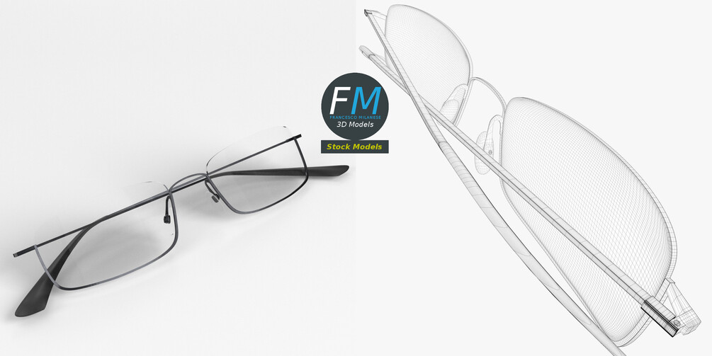 Top rimless style eyeglasses 3D Model. 4 individual objects (frame, lenses and nose pads, right temple, left temple; so, you can easily rotate or even animate the temples), sharing 2 non overlapping UV Layout maps, Materials (lenses, other) and PBR Textures sets. Production-ready 3D Model, with PBR materials, textures, non overlapping UV Layout map provided in the package.