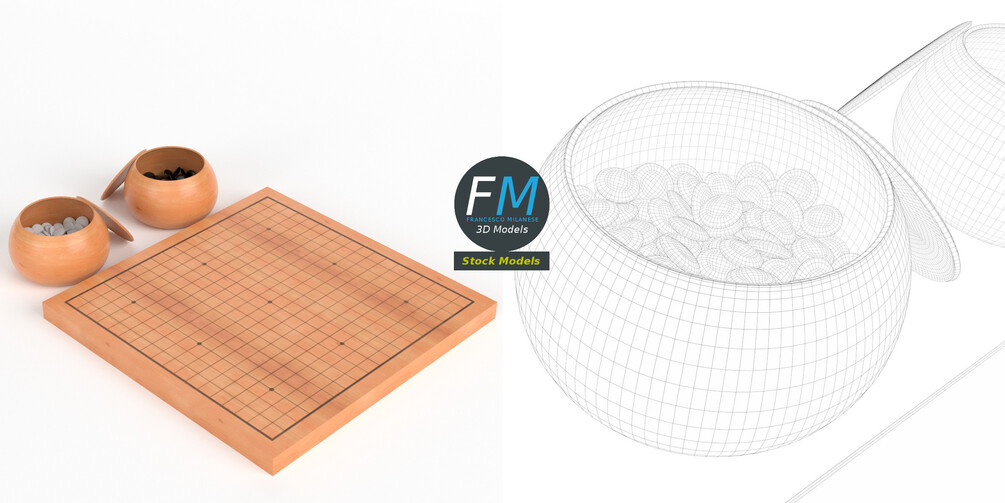 GO board game set 3D Model. 5 objects (black stones, white stones, board, container 1, container 2), sharing 3 non overlapping UV Layouts, Materials (white stones, black stones, board and containers) and PBR Textures set. Production-ready 3D Model, with PBR materials, textures, non overlapping UV Layout map provided in the package.