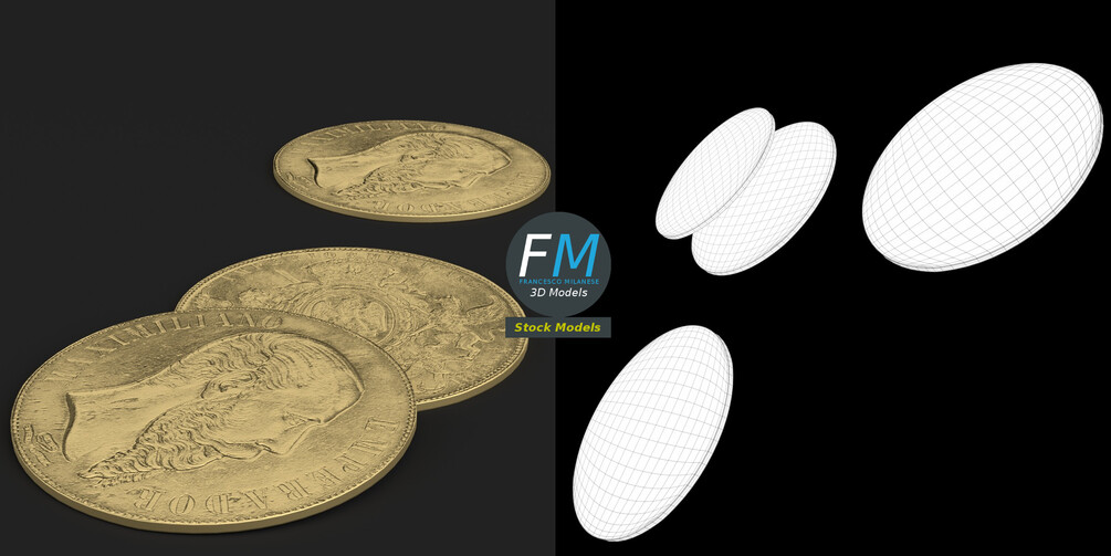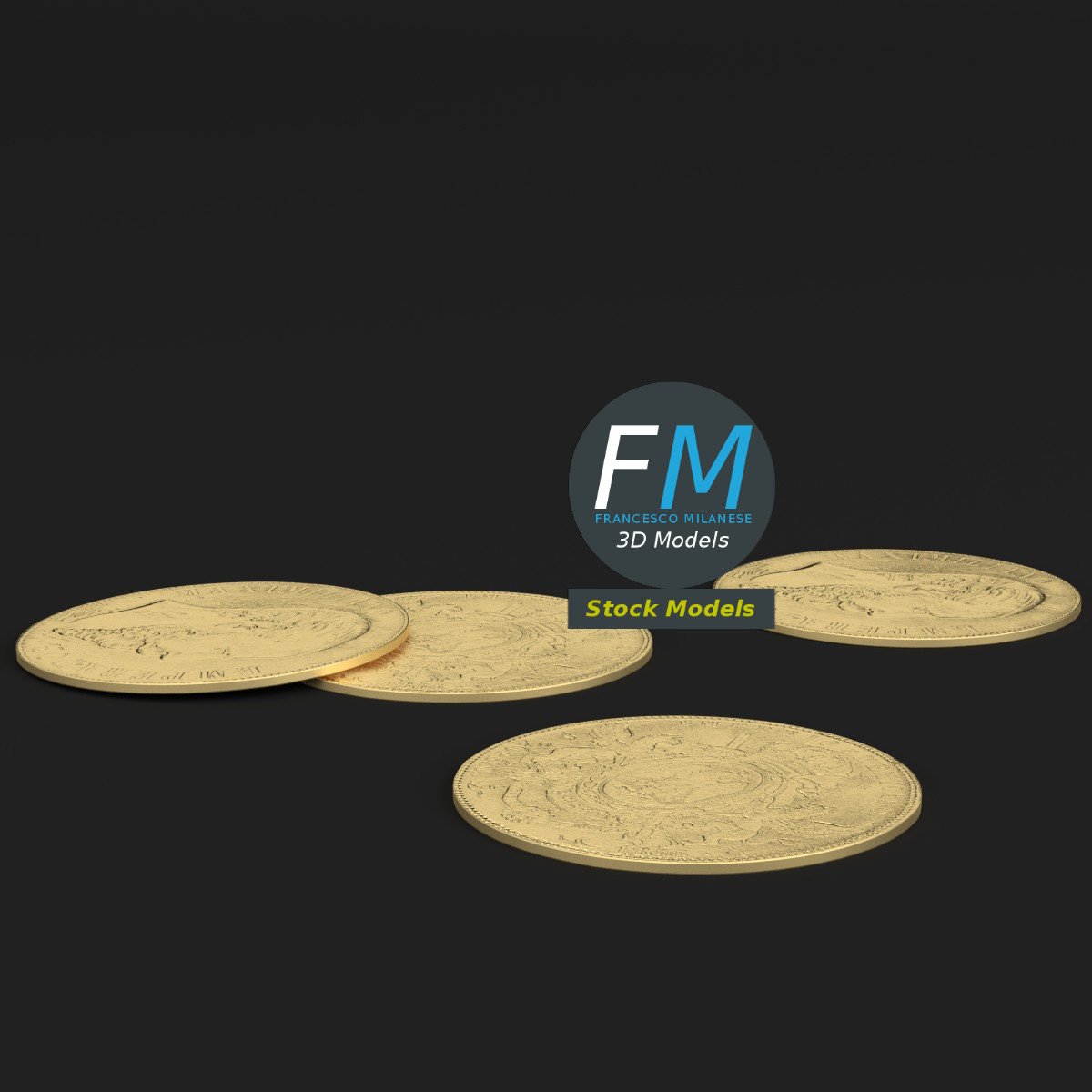 Stylized gold coins 3D Models. 4 individual objects, sharing the same non overlapping UV Layout map, Material and PBR Textures set. Production-ready 3D Model, with PBR materials, textures, non overlapping UV Layout map provided in the package.