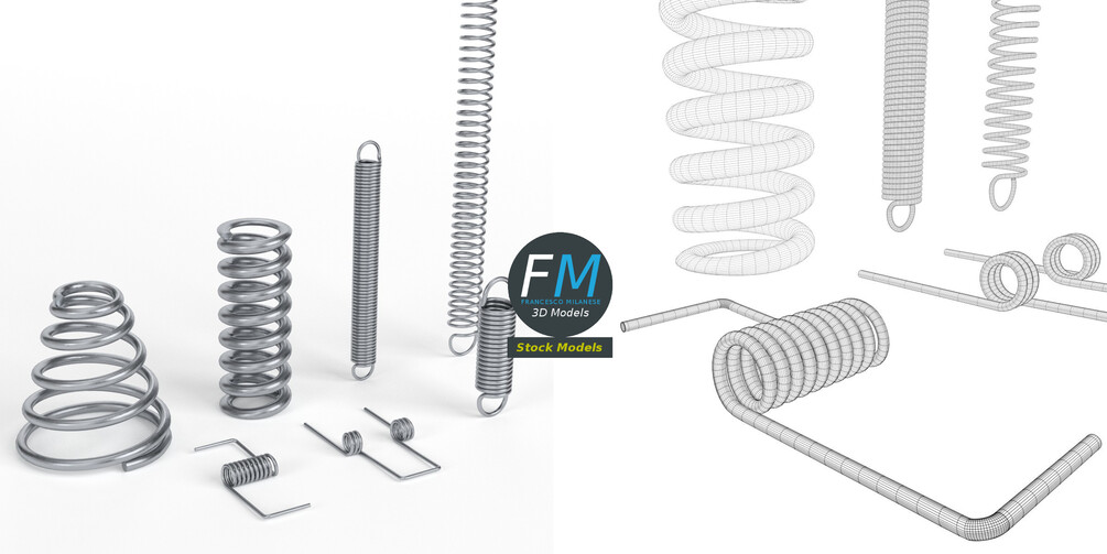 Hardware springs 3D Models. 7 individual objects sharing the same non overlapping UV Layout map, Material and PBR Textures set. Production-ready 3D Model, with PBR materials, textures, non overlapping UV Layout map provided in the package.